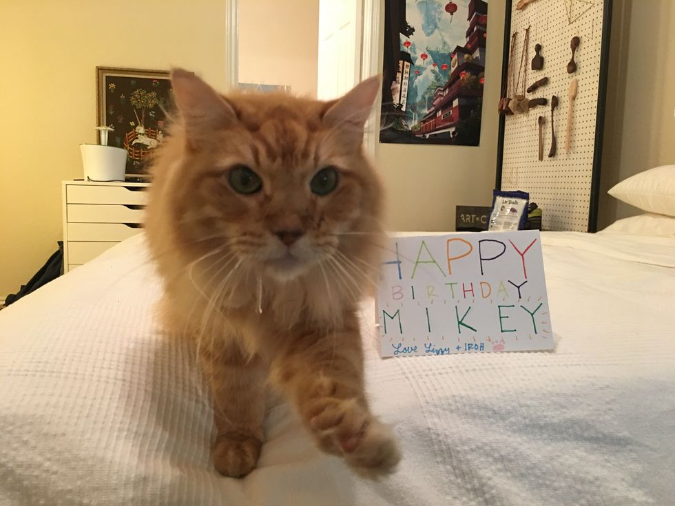 "Posing with a birthday card for his cat dad. He's a little drool monster."