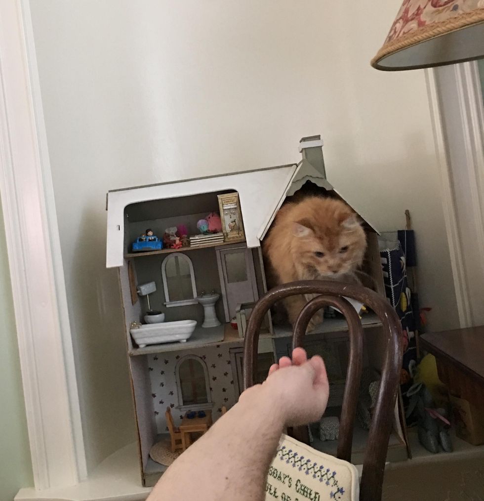The lion kitty discovered his mom's childhood doll house and decided to crash in :).
