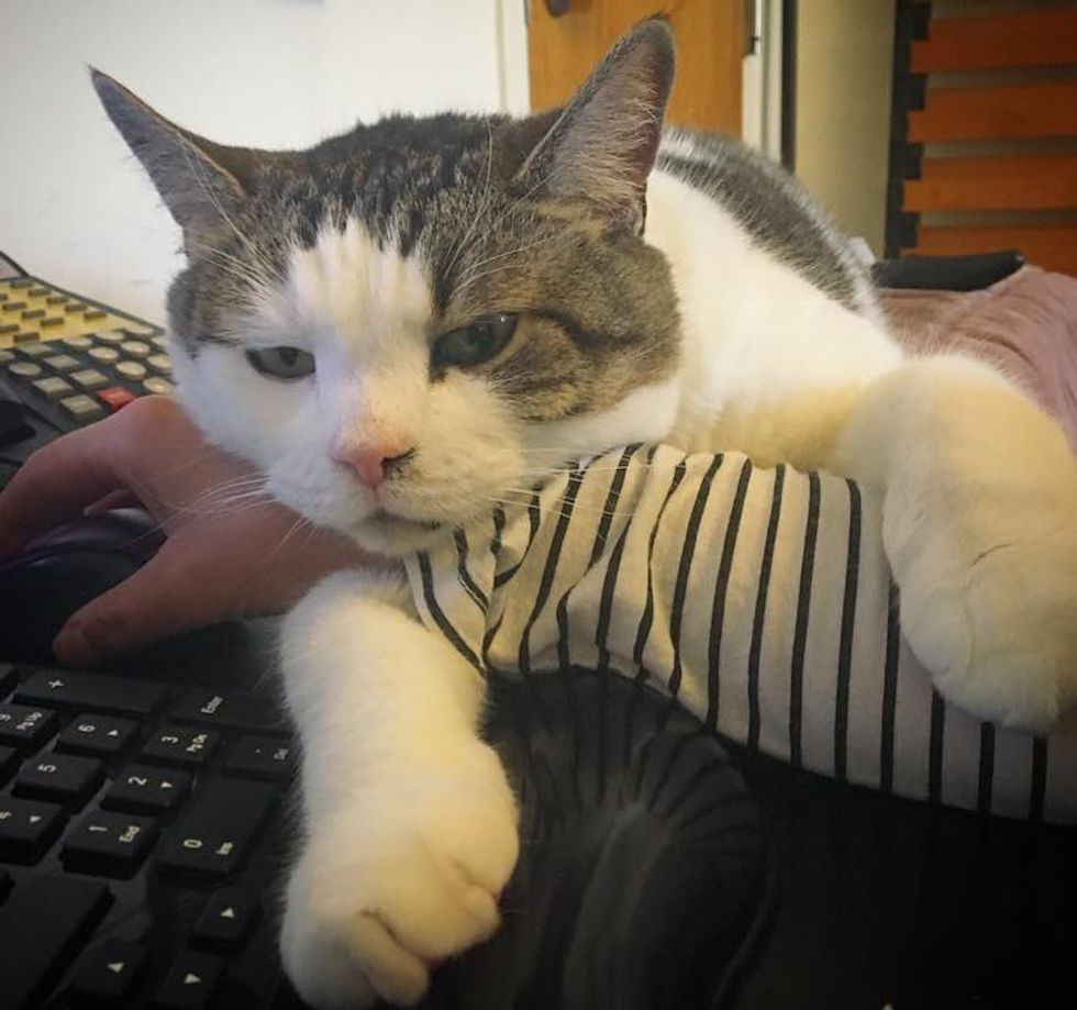 "If you don't respond to him right away, he will then jump up on your desk and sit on your computer keyboard while you're trying to work in order to get his way, which works every time."