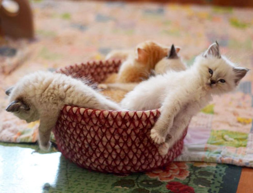 Besides napping "in piles, in puddles, in rows - on their bellies and on their backs," these little foster kitties love their cozy red basket.