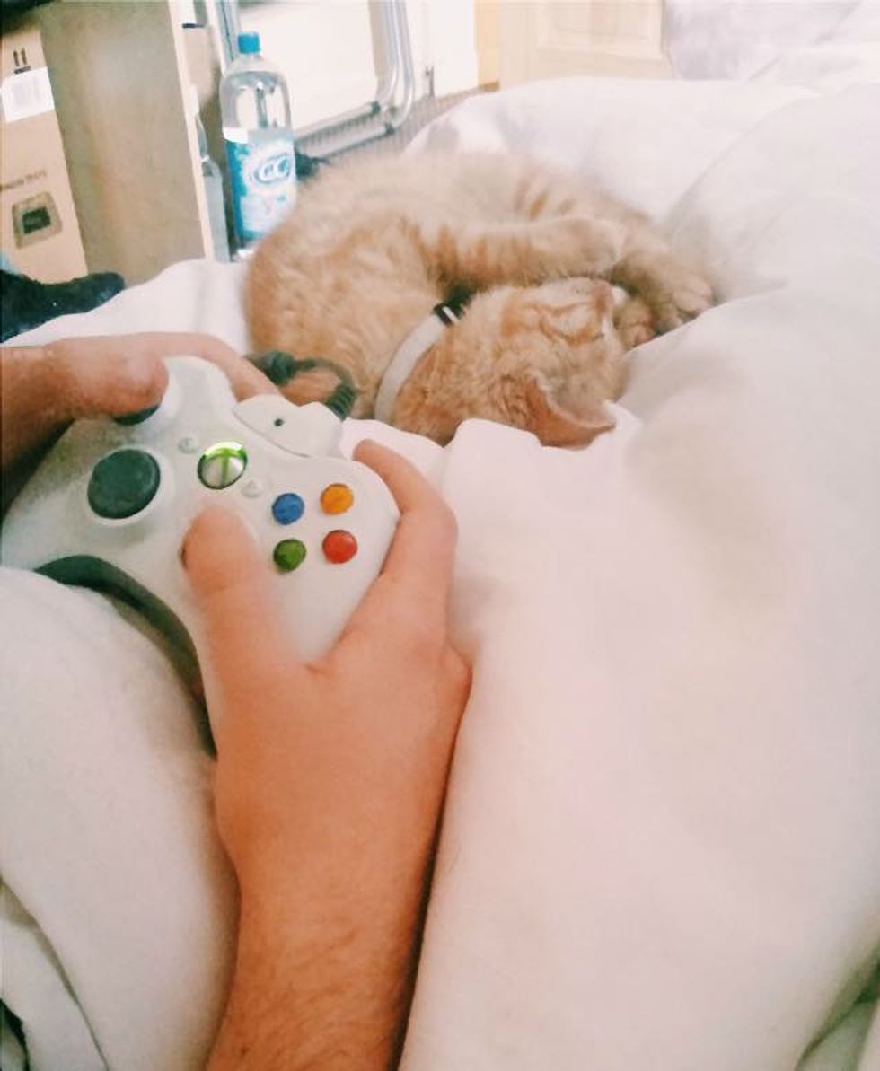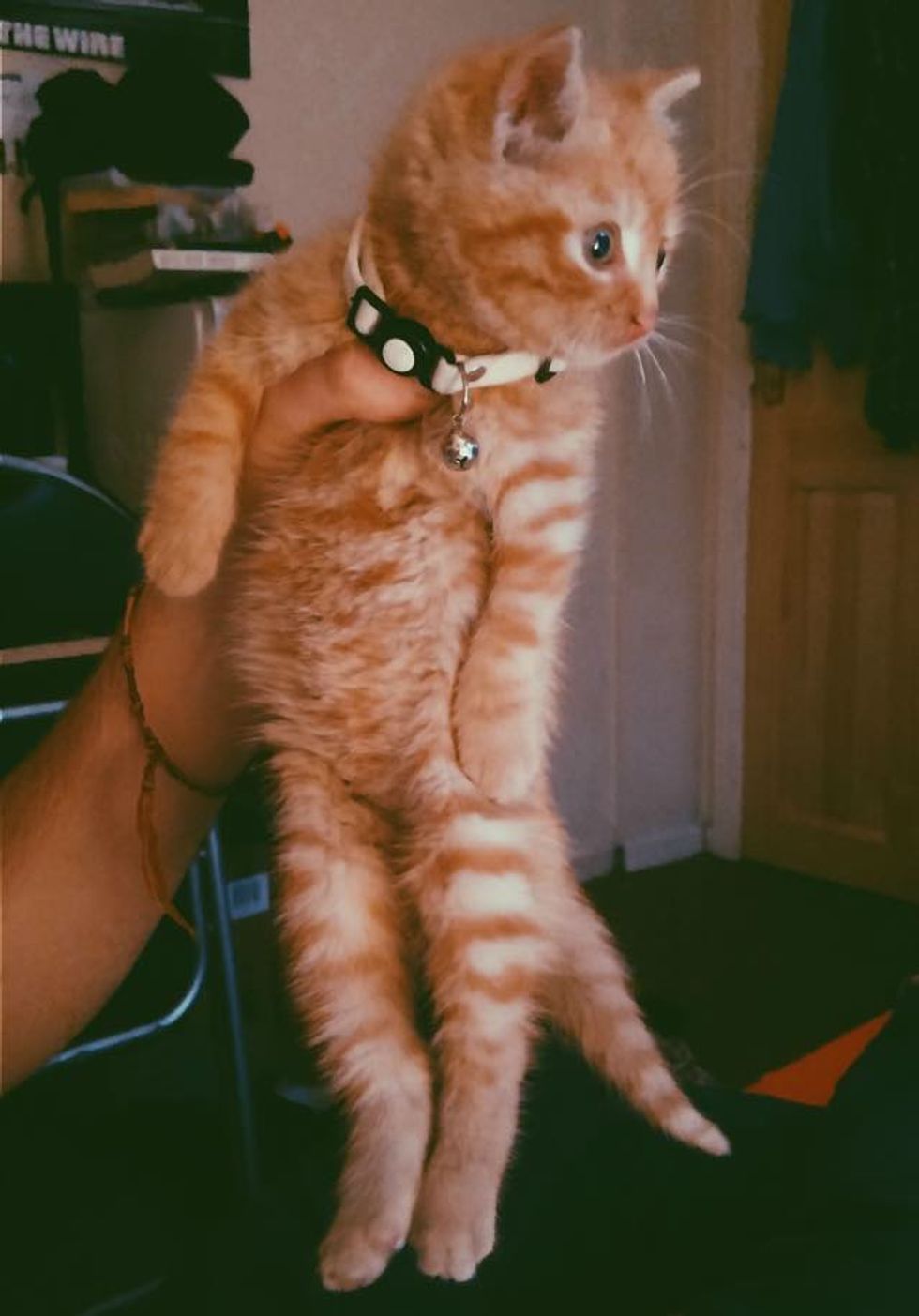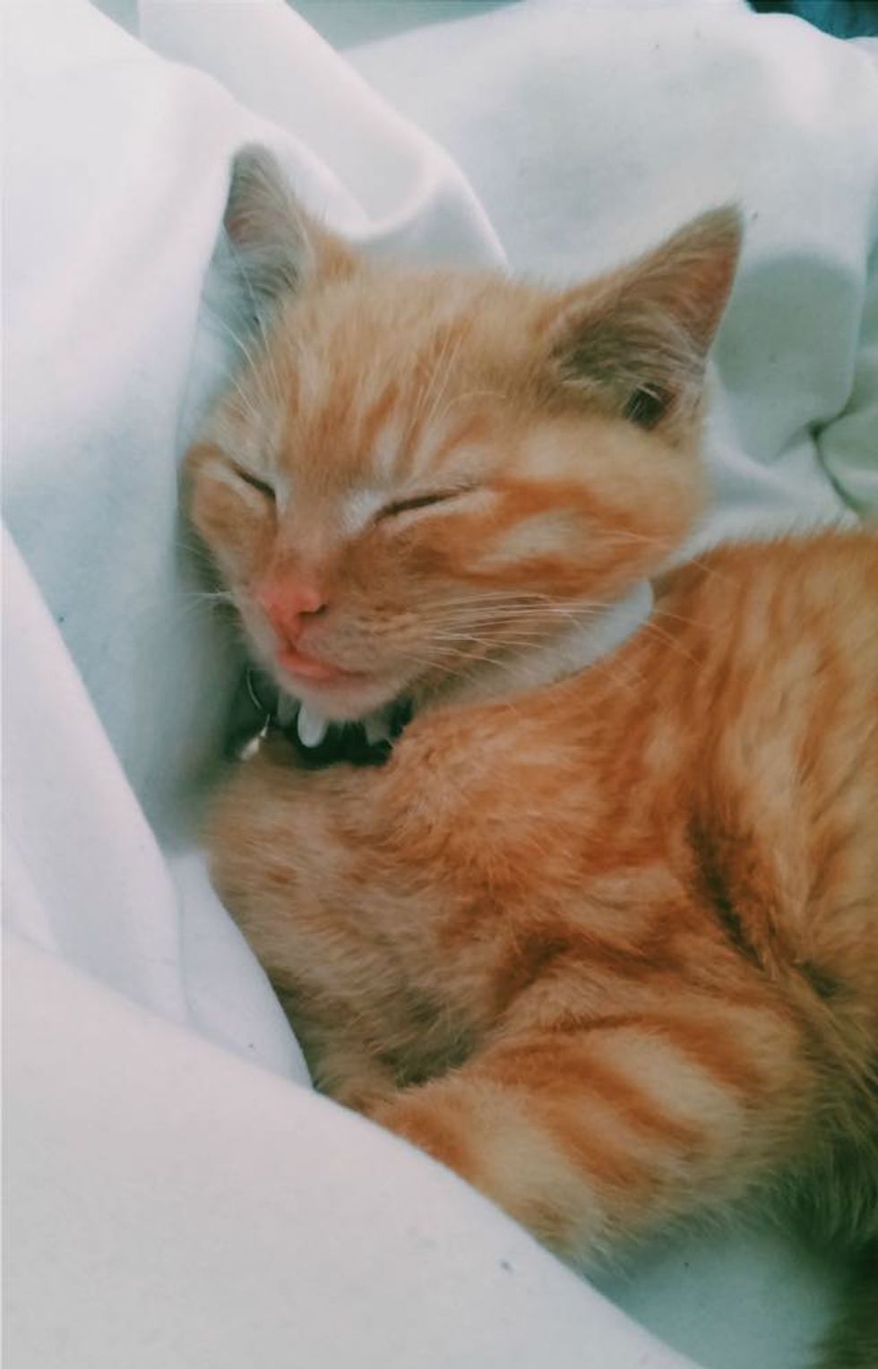 The kitty was very scared when they picked him up. "(He was) constantly meowing and crawling all over our arms and shoulders, trying to get away. It was only when we got him into bed and cosy with the lights out did he calm down and sleep for hours - a lot longer than we now know he would usually sleep for."