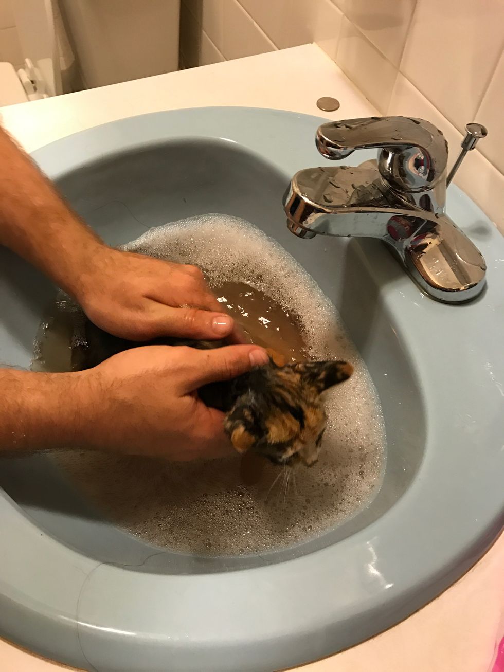 He carefully reached down to retrieve the kitten. "She let me pick her up, and she didn't get skittish until after she got inside (my apartment)."