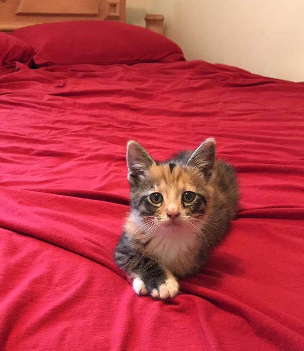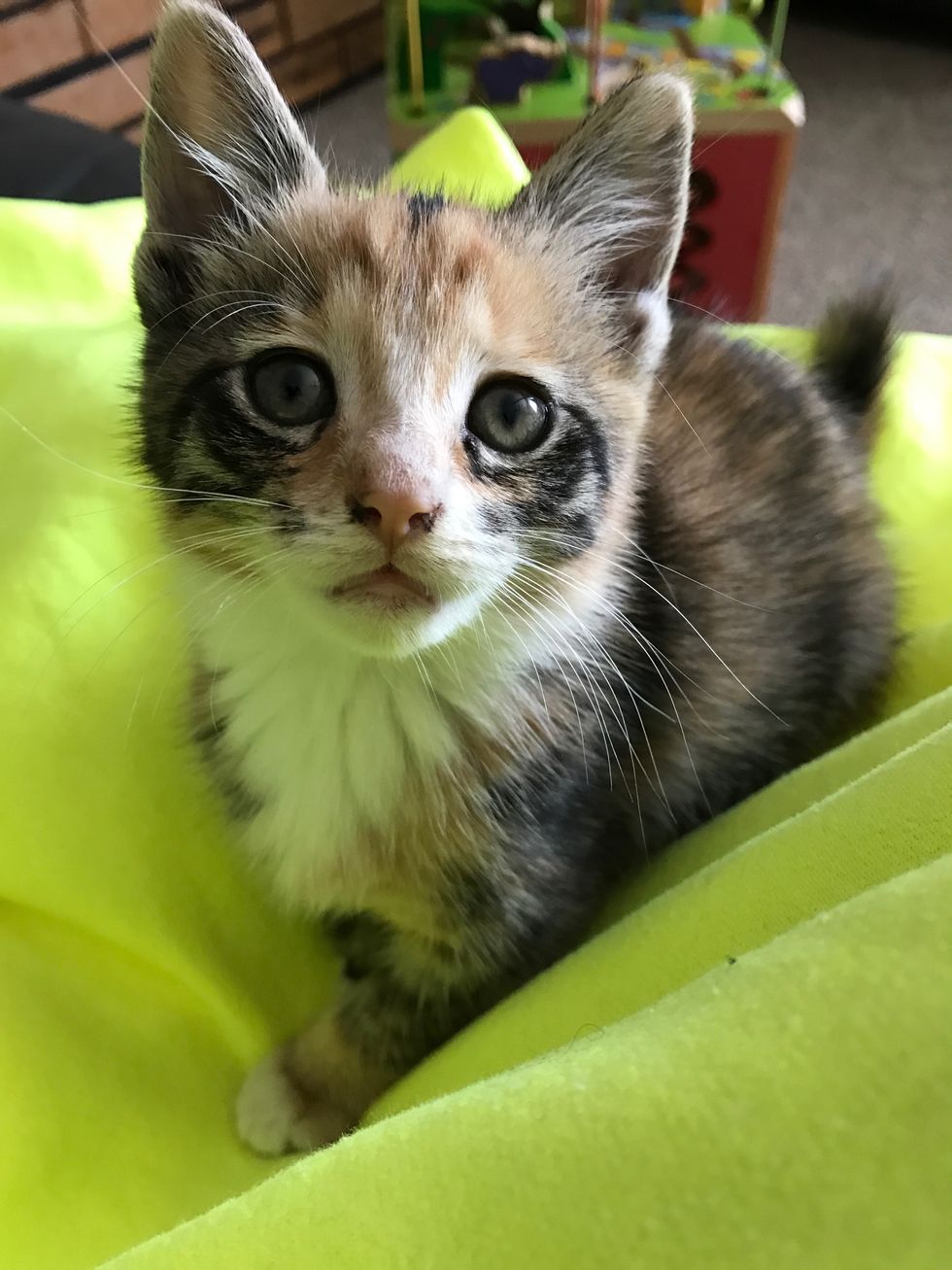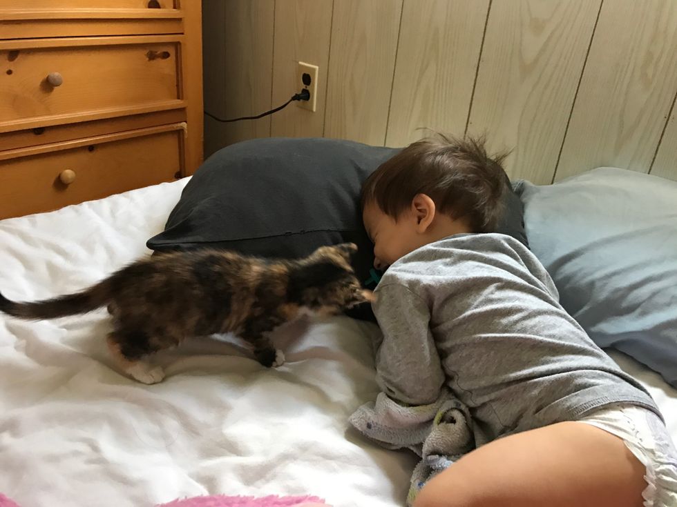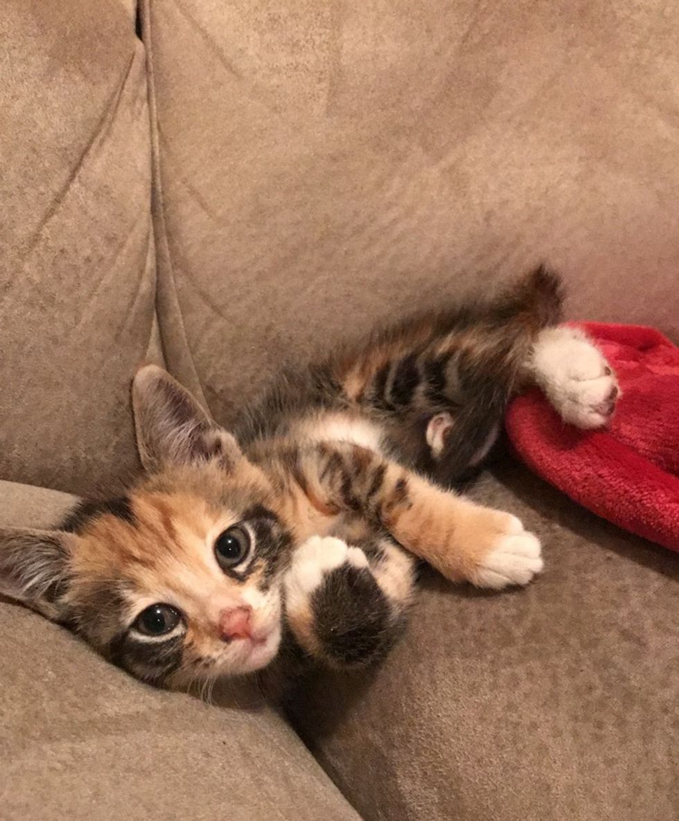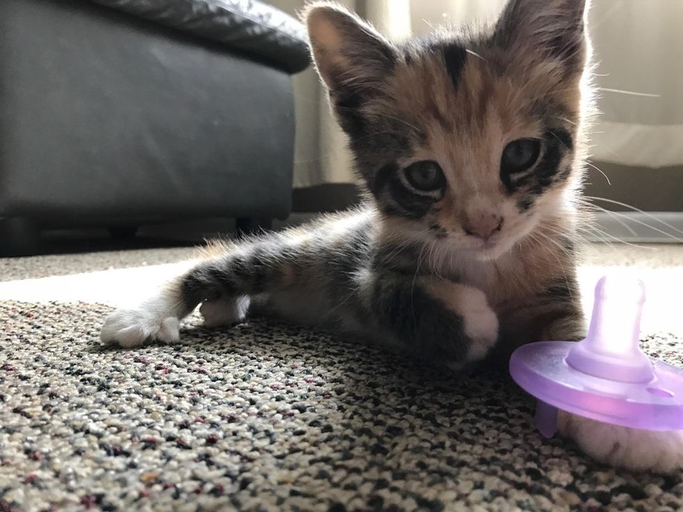 Mary's friend, Smiths, heard about the kitten's story and immediately offered to adopt her. Her two-year-old son had been asking for a "Meow Meow" for a long time, and the mother thought the little Calico would be the purrfect friend for him to grow up with.