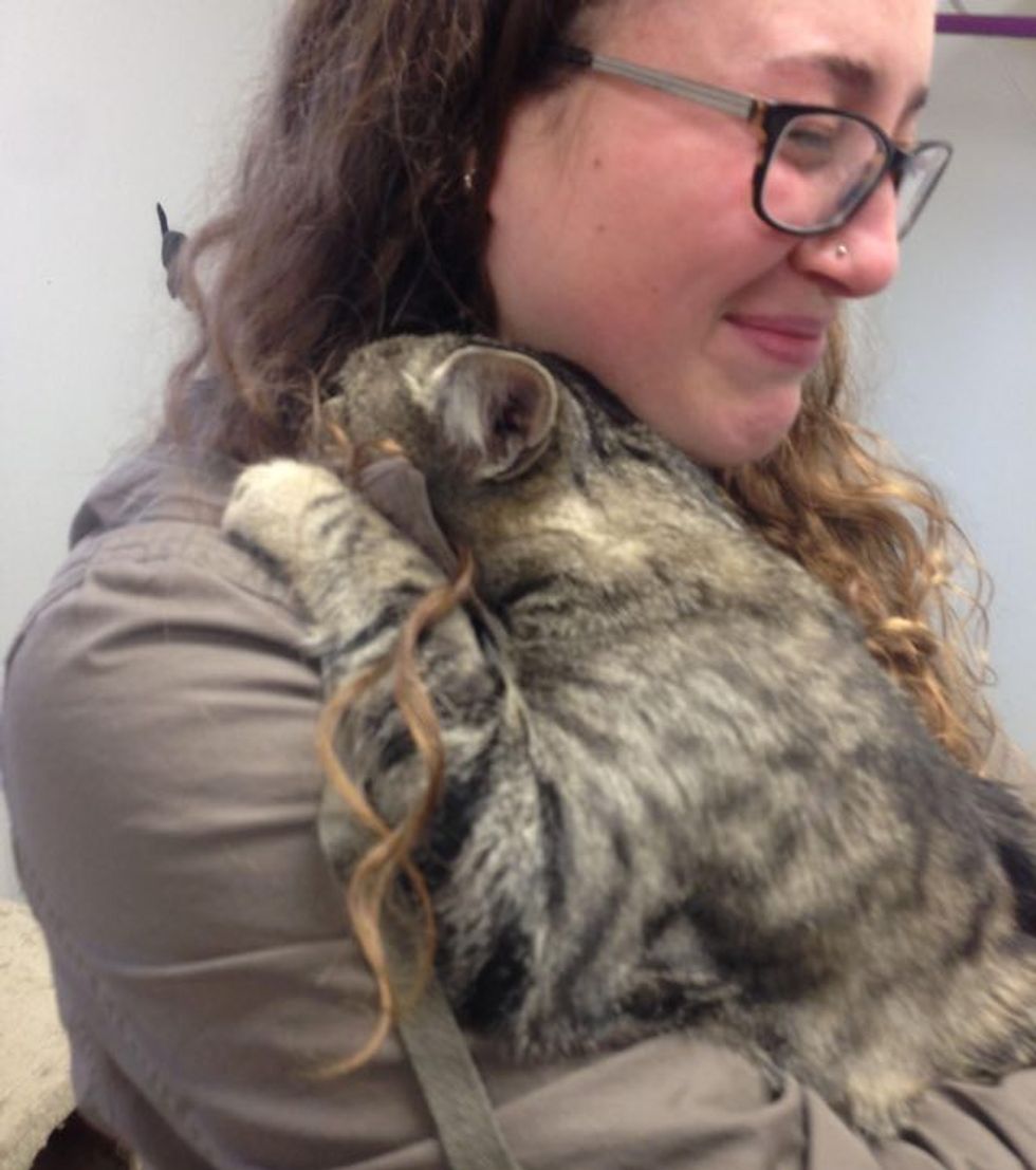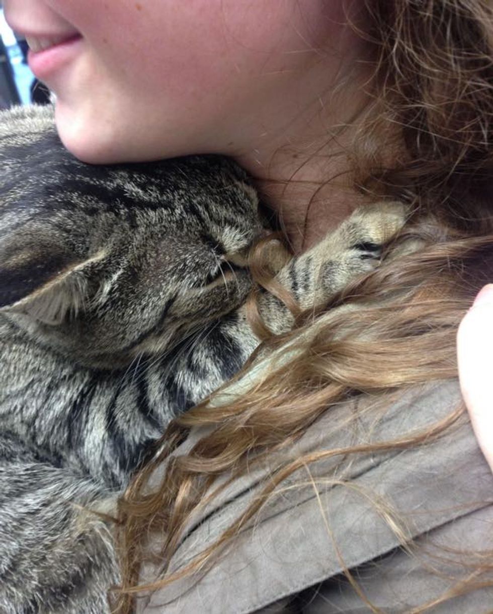 "I started crying at the animal shelter because one cat hugged me and nuzzled into my neck," said Rachel via reddit.