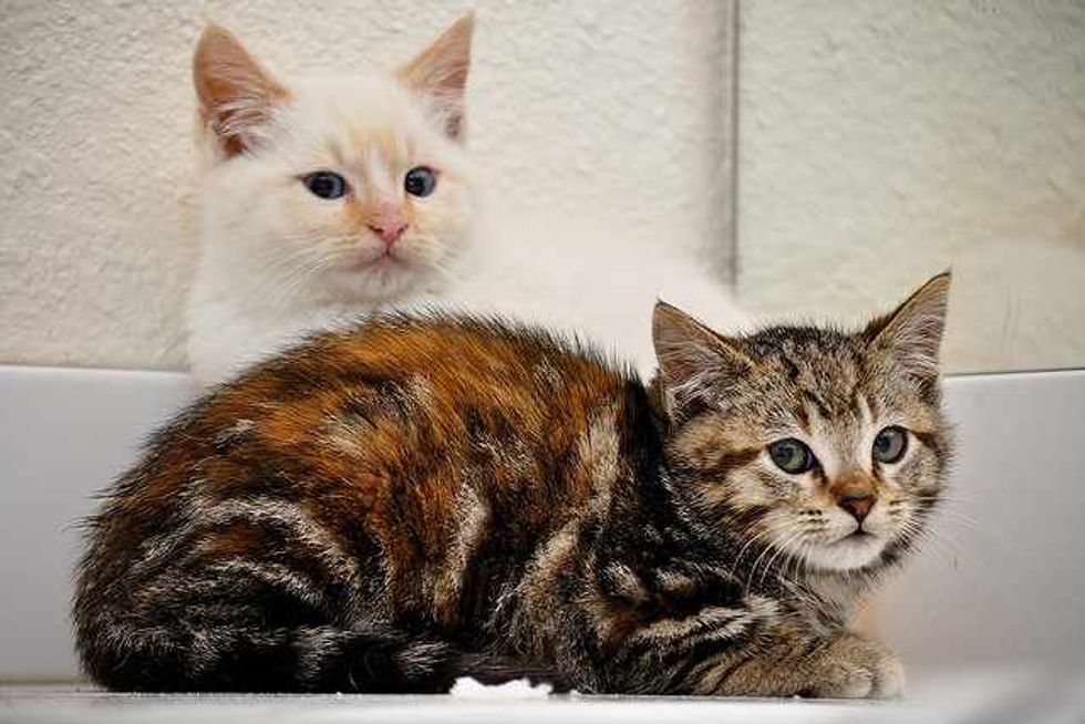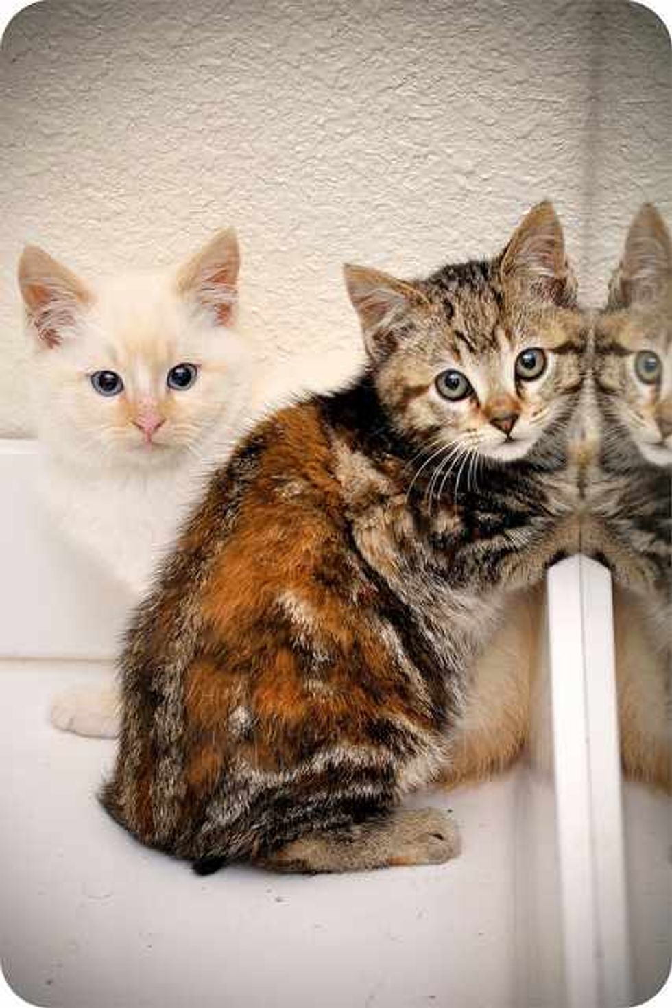 Two feral kitties showed up in our back yard in Feb and we caught them the same day (through our Trap-Neuter-Return or TNR). We kept them in hopes to get them adoptable. However, they were a little tricky. Neither really made much progress in their first month, which was interesting considering they were quite a bit younger than the other group of older kittens we'd trapped in September. (Just goes to show how genetics plays a huge roll in sociability and the importance of socializing kittens as young as possible.)