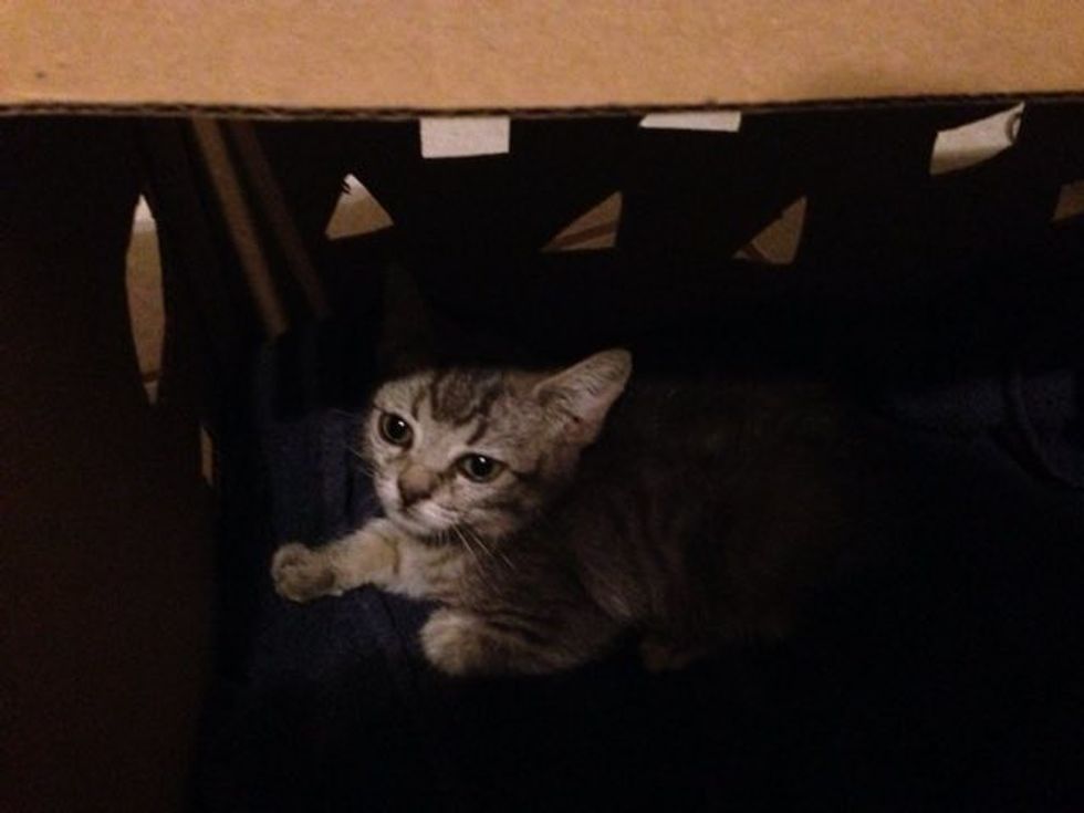 "A stray kitten got into my car while I was at work. After 4 hours of trying to make it get out of the dashboard, and in the process of removing the dash. She decided to come out. She's a healthy shy stray kitten. Come meet our little girl!"