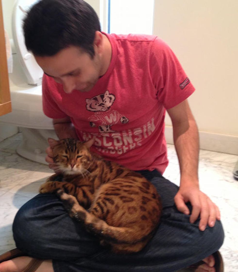 When they let him out of the crate after Duma arrived at his new home, the Bengal cat hopped on his human dad's lap and started purring away. It was as if he was saying "Thank you for being my human."