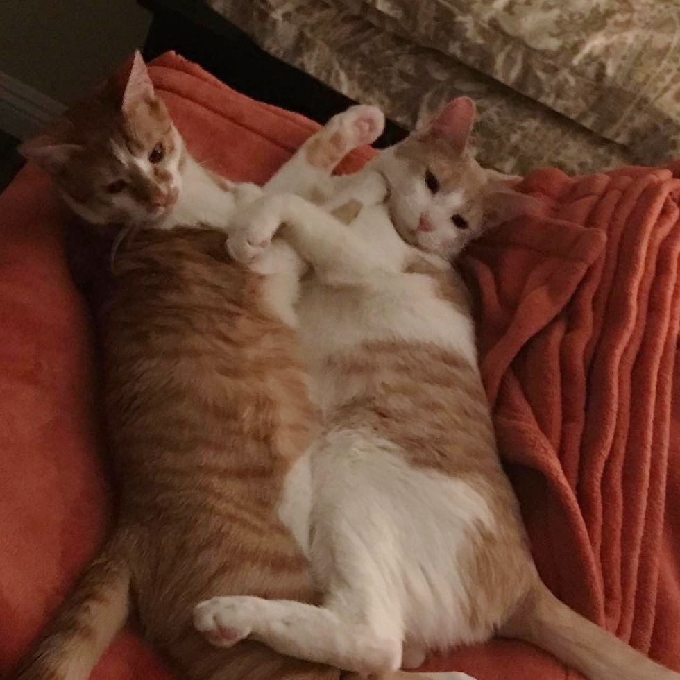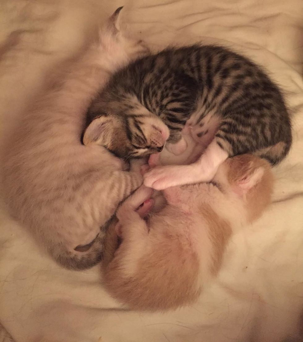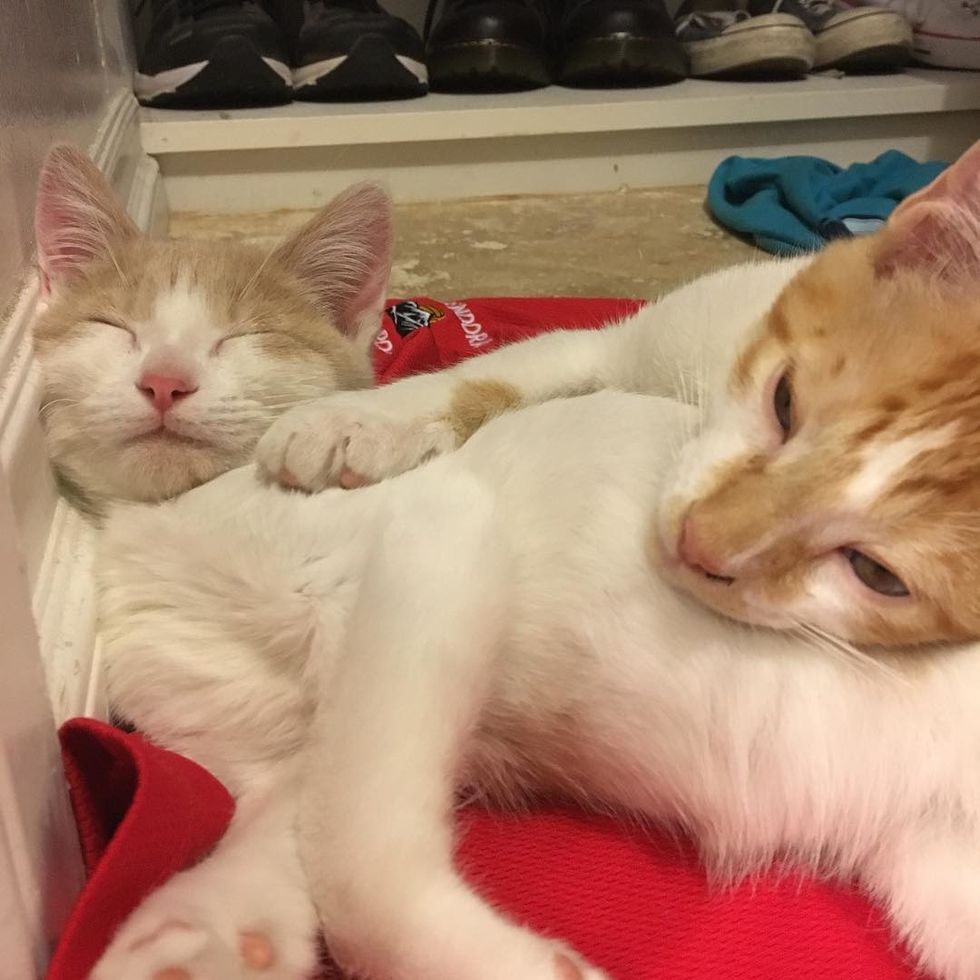 From that day on, little Colby stayed close to his new feline family and the cuddlefest began.