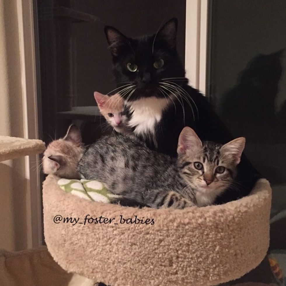 "A lot of nights when I walked into the foster room I found all four of them curled up together in this small basket on the top of the cat tree.