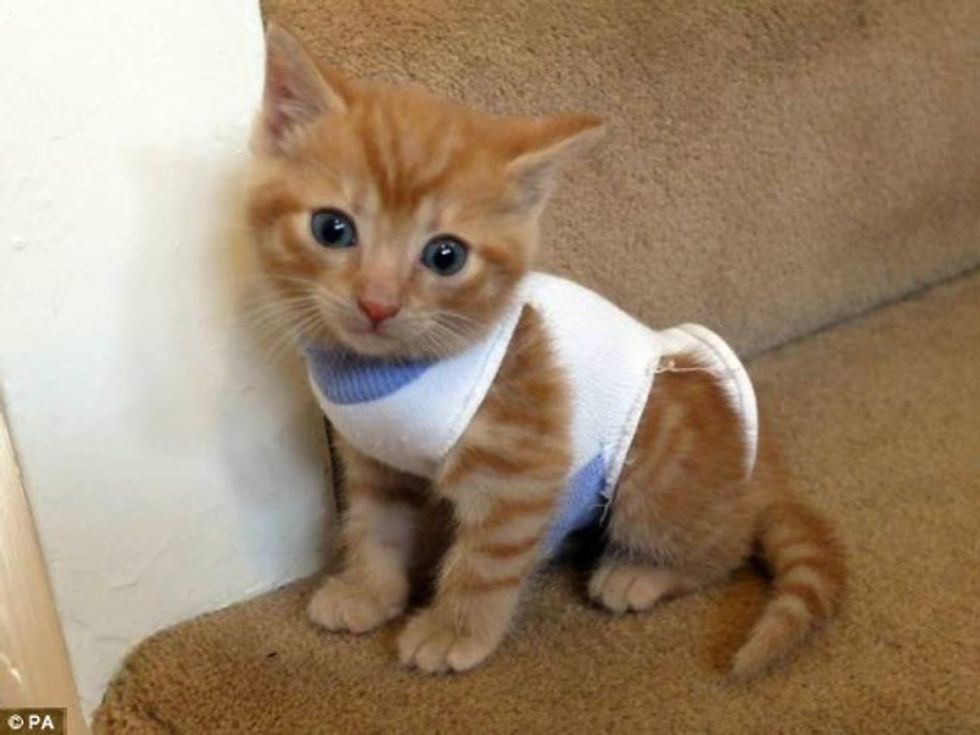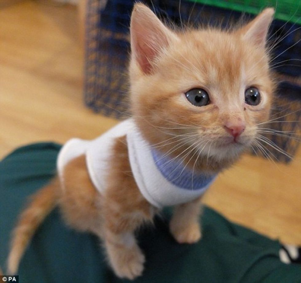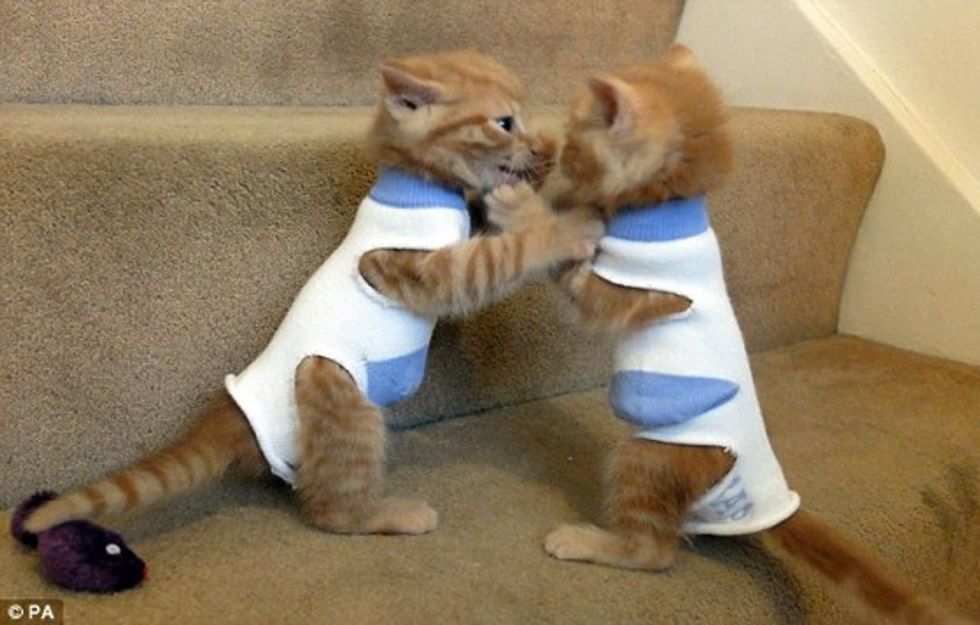 Meet George and Elton, two tiny ginger tabbies, found abandoned in a shed. They were in poor condition when the RSPCA took them into their care. The kitties are little fighters. They have been nursed back to health and are now wearing protective coats made of baby socks to keep them warm and safe.