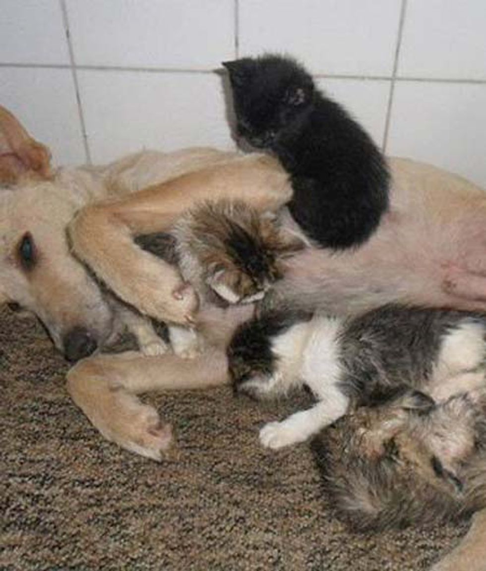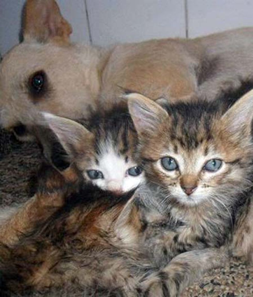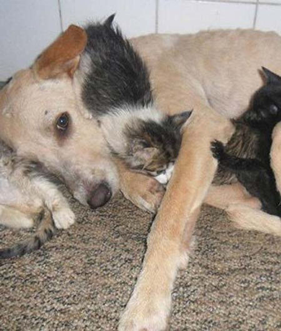 The dog named Banzé (or “Scamp”) is also a rescue from the streets. "So when he heard the plaintive mews of an abandoned litter of kittens, he didn't hesitate to save them, as he had once been saved." (Pawnation)