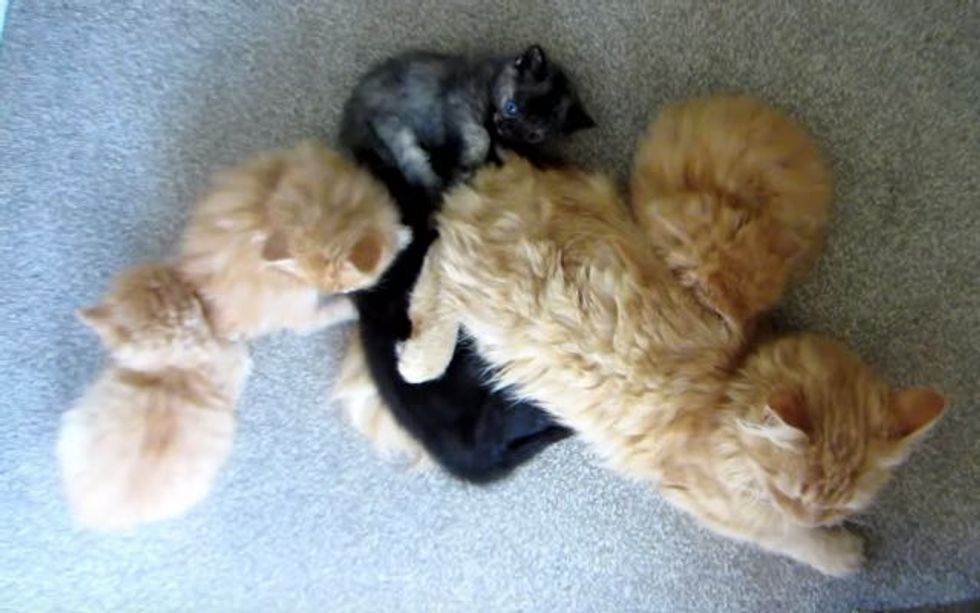 5 little fur babies snuggling with the big kitty. It's a furry cuddle train!