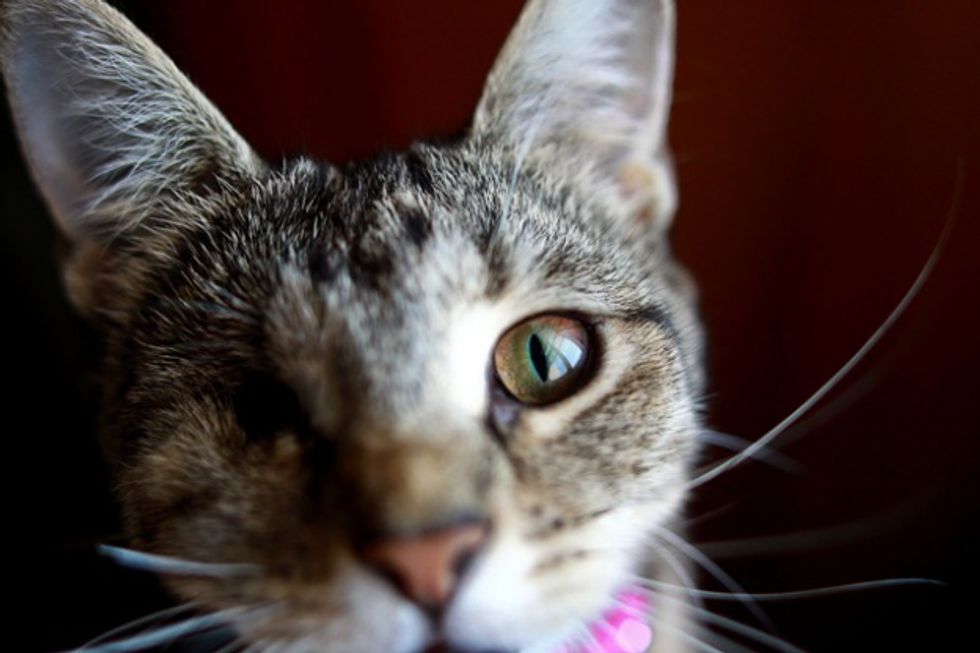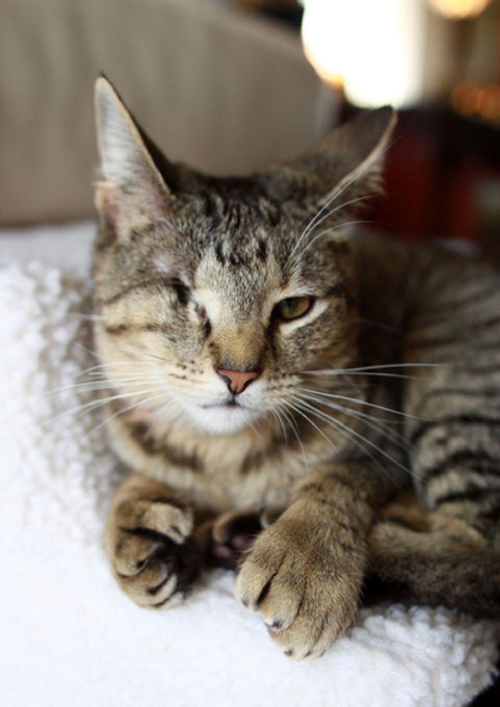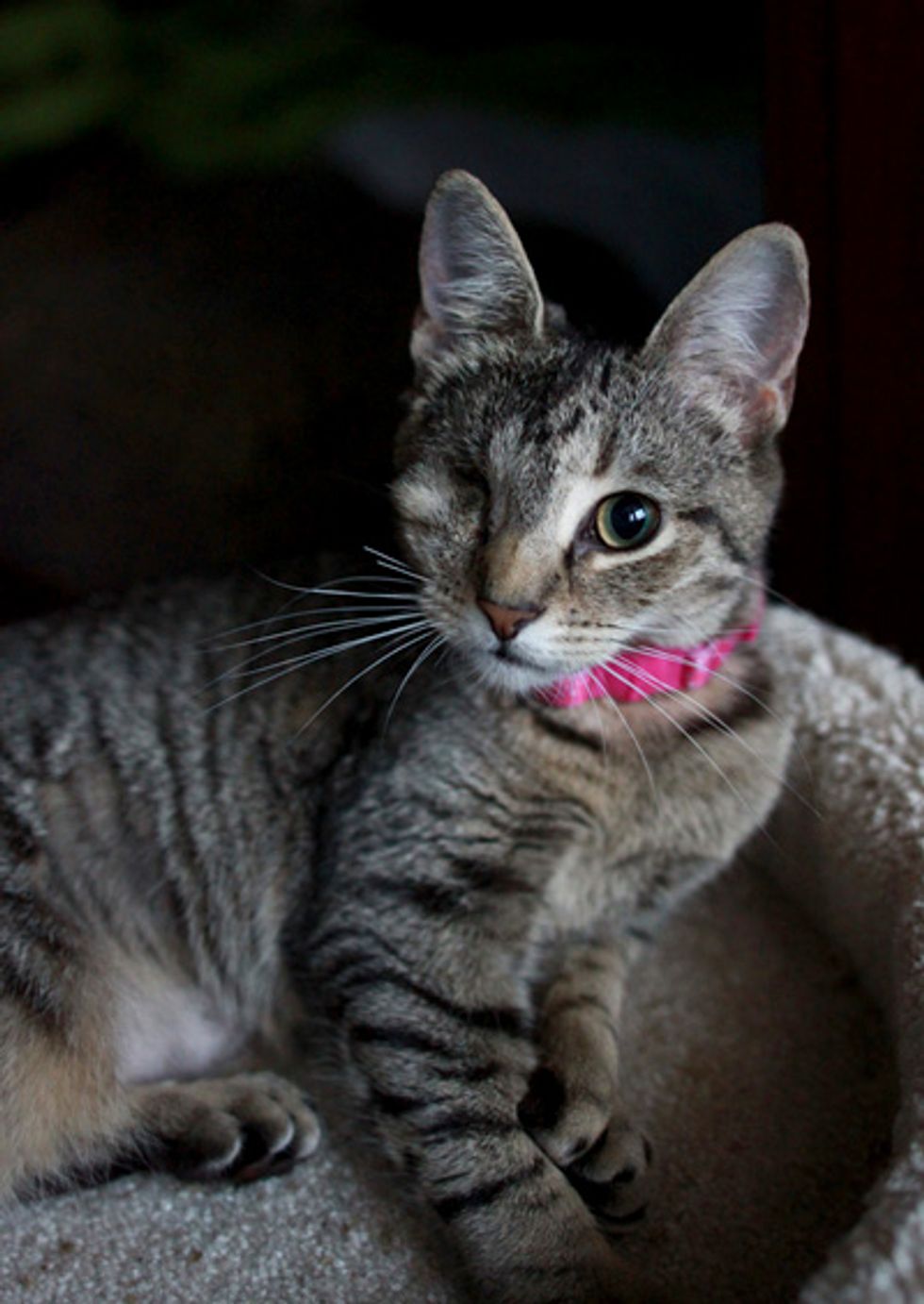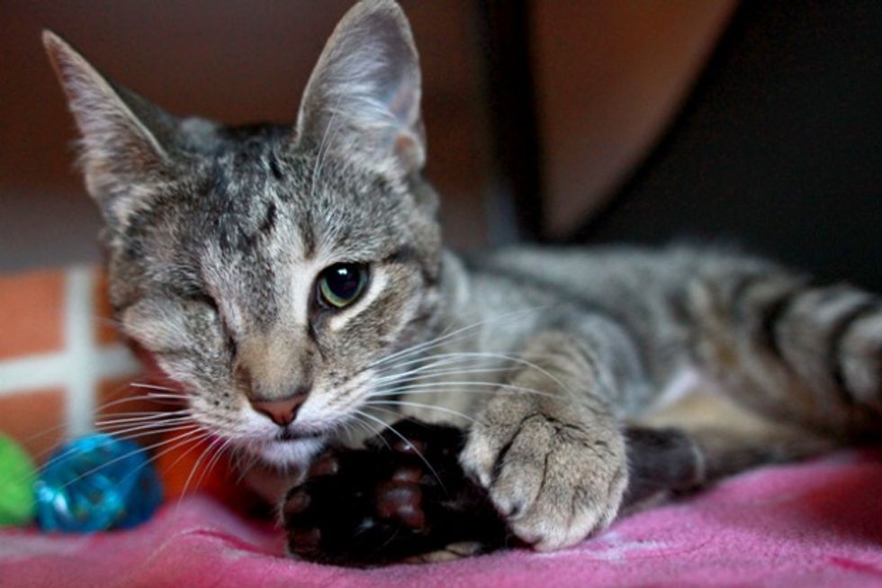 I work at a no-kill animal shelter, and she and 3 of her litter-mates came to us as young kittens, with Upper Respiratory Infections (URI) and scabies. The scabies eventually got better, but they all were sick with the URI for quite a while. Sparkle ended up losing her eye to the URI. It spread to the eye, and damaged it so badly that it had to be surgically removed.
