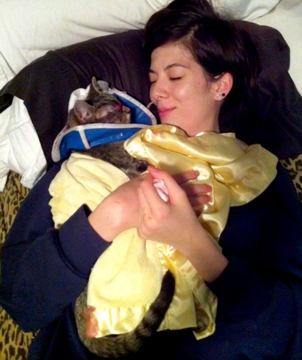 All of the kittens were very shy and skittish. She was probably the most skittish of the group. That night, after her surgery, she ended up coming home with me. I was the one who volunteered to foster her and make sure she made it ok through the night. My dad also helped me. She was sedated, but still very scared. I held her in my arms, wrapped in a blanket for hours.