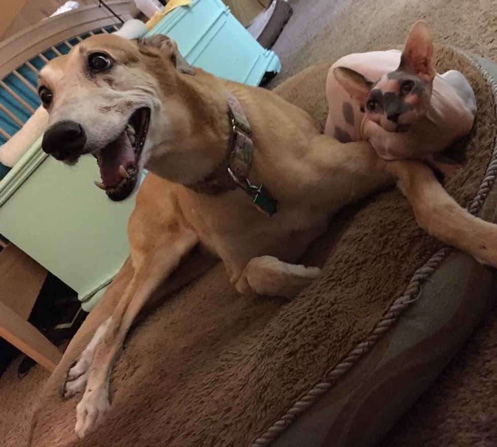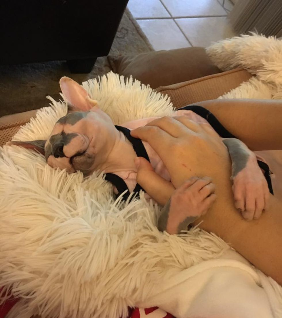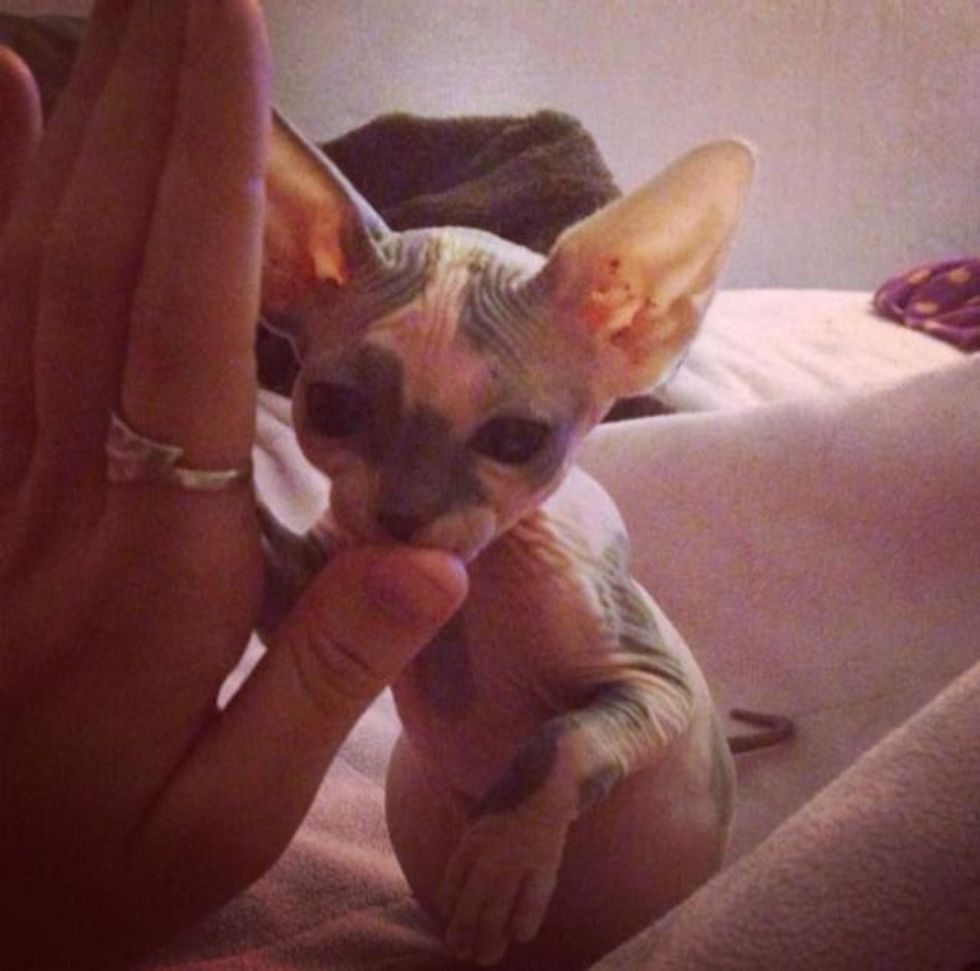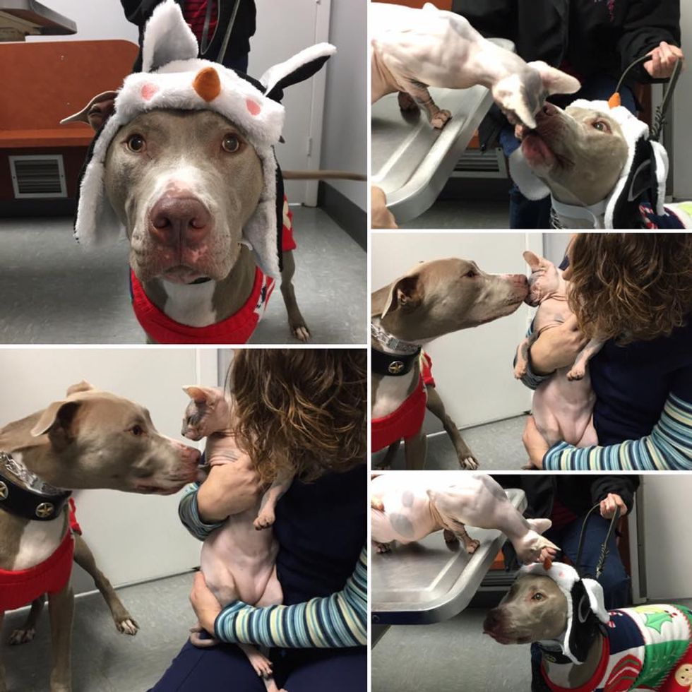 From Raisin's Facebook page: "Fenway instantly fell in love with me and when Mom would pick me up he would moan and look for me! We played together and he was so gentle with me. Mommy said 'A Sphynx and a Pitbull what a beautiful but unusual mix!'"