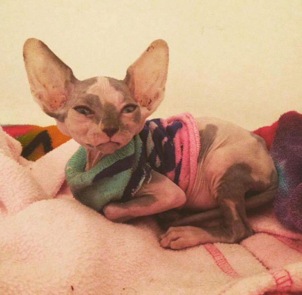 A sweet hairless kitten who was surrendered to a shelter because she had a medical condition, was given a second chance at life by someone who would not give up on her.