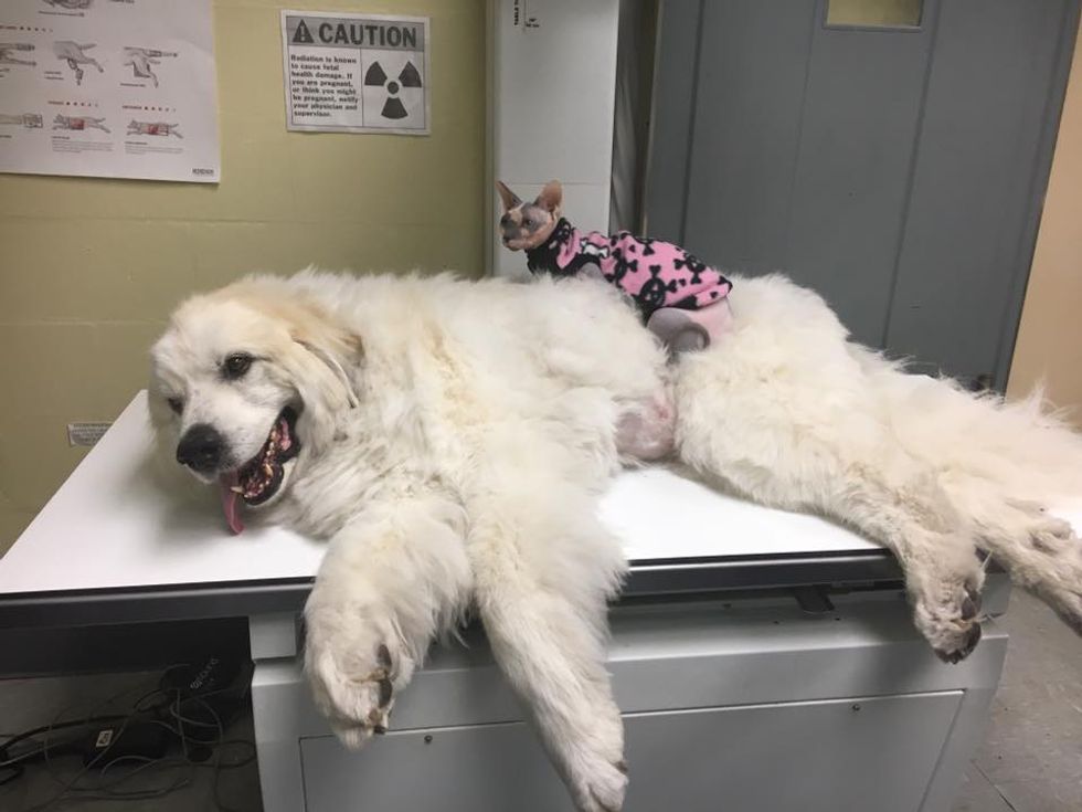 She hops onto the X-Ray table to give the big fluffy patient some support before the procedure.