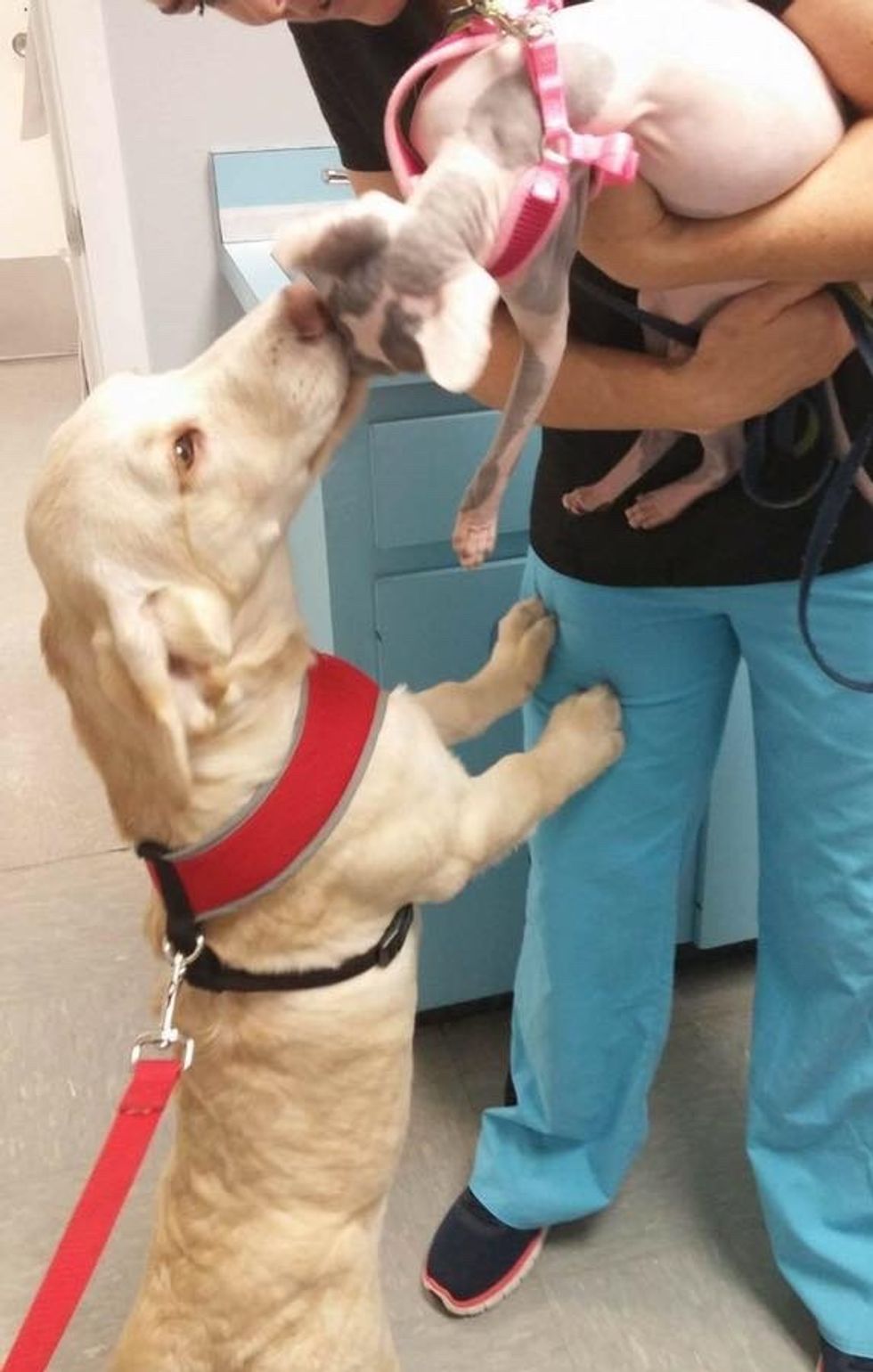 Raisin giving a puppy some love, telling him everything is going to be all right.
