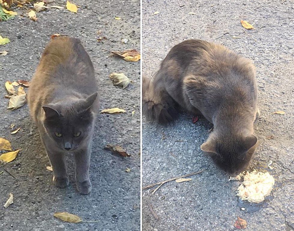 The friendly stray dove right in and scarfed down the food. While she was half way through, she began to coo and meow. "At first, Milena thought the kitten was just happy about having something to eat, making joyous little meows, but suddenly, she heard another cat coming from behind."