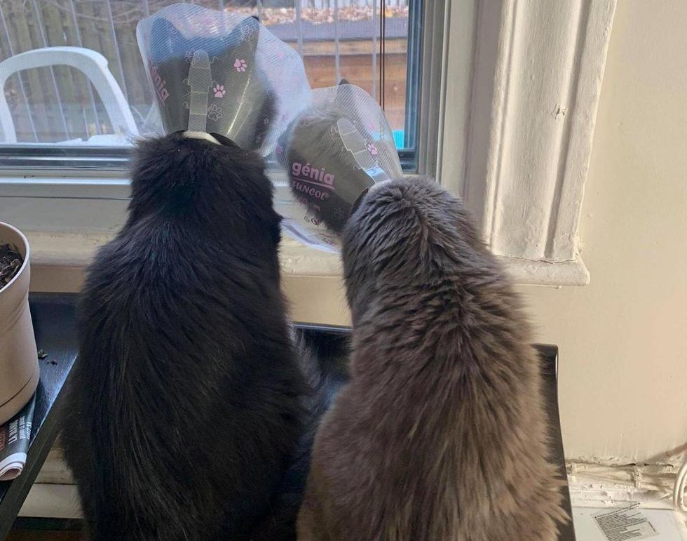 After getting spayed, Keisha insisted on washing her sister's face, even though the cones were in the way.