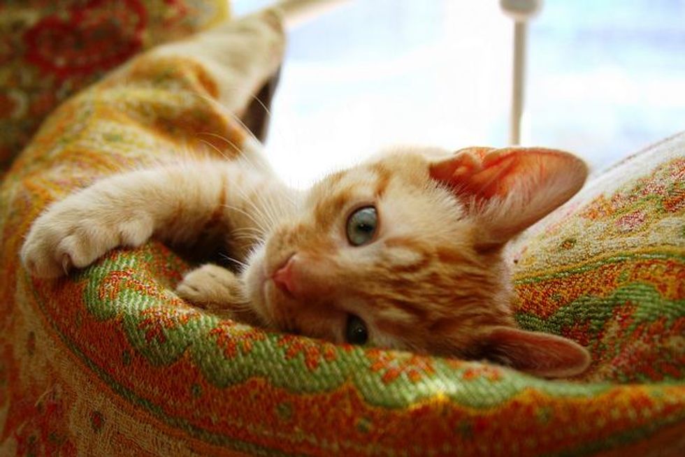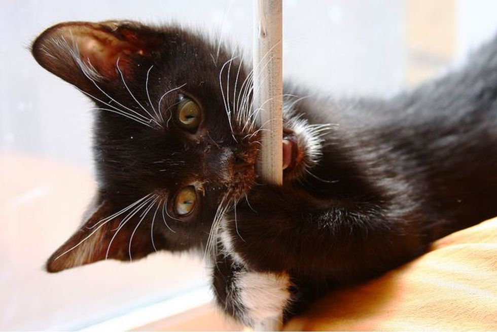Oreo was very thin and sick with an upper respiratory infection. But he never gave up trying to eat and play, and now he's healthy and bouncing around all over the place. He's got so much energy and loves to play all the time! He's ready to be adopted but sticking around with Mac so that they both have a buddy kitten. He wound up teaching Mac the ropes on climbing and playing too!