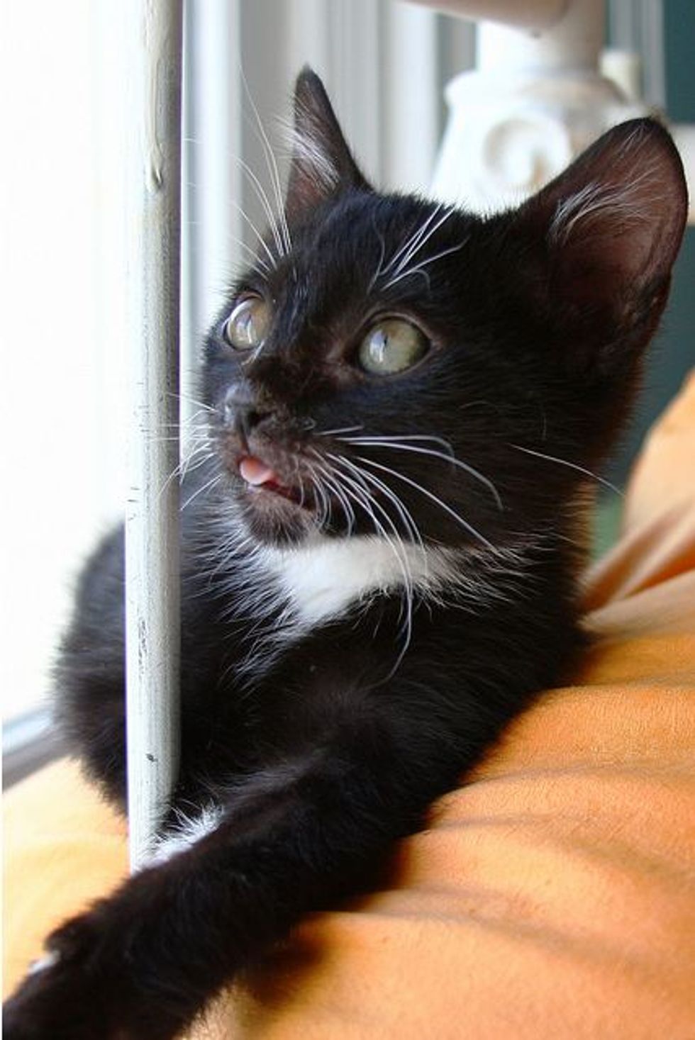 Mac came to the Houston SPCA with his tail severely damaged - most of it had been ripped off, no one knows if it was an animal attack or if it got caught in some type of machinery. The HSPCA amputated most of his tail (except for about an inch), and he is recuperating with me (and Oreo) until his tail heals. He's a little more frightened than most kittens, but once he learns to trust you he is very sweet and affectionate.