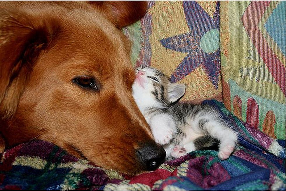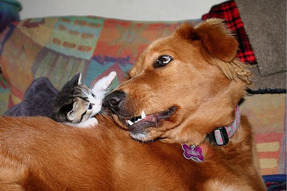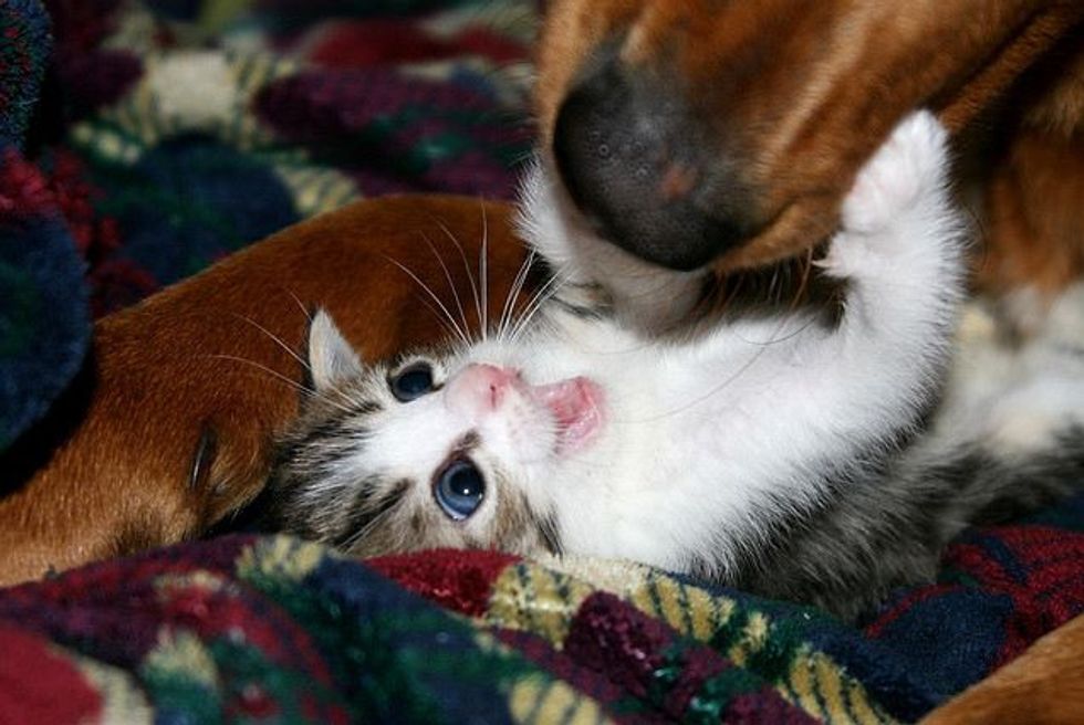 Terri Green brought home a little rescued kitten that still needed to be bottle fed. When he arrived in his foster home, he immediately befriended Rucca the brown dog. "The little foster was a daring young guy. It was so fun to see him so fearless and playful at this age, and Rucca is so good with him."