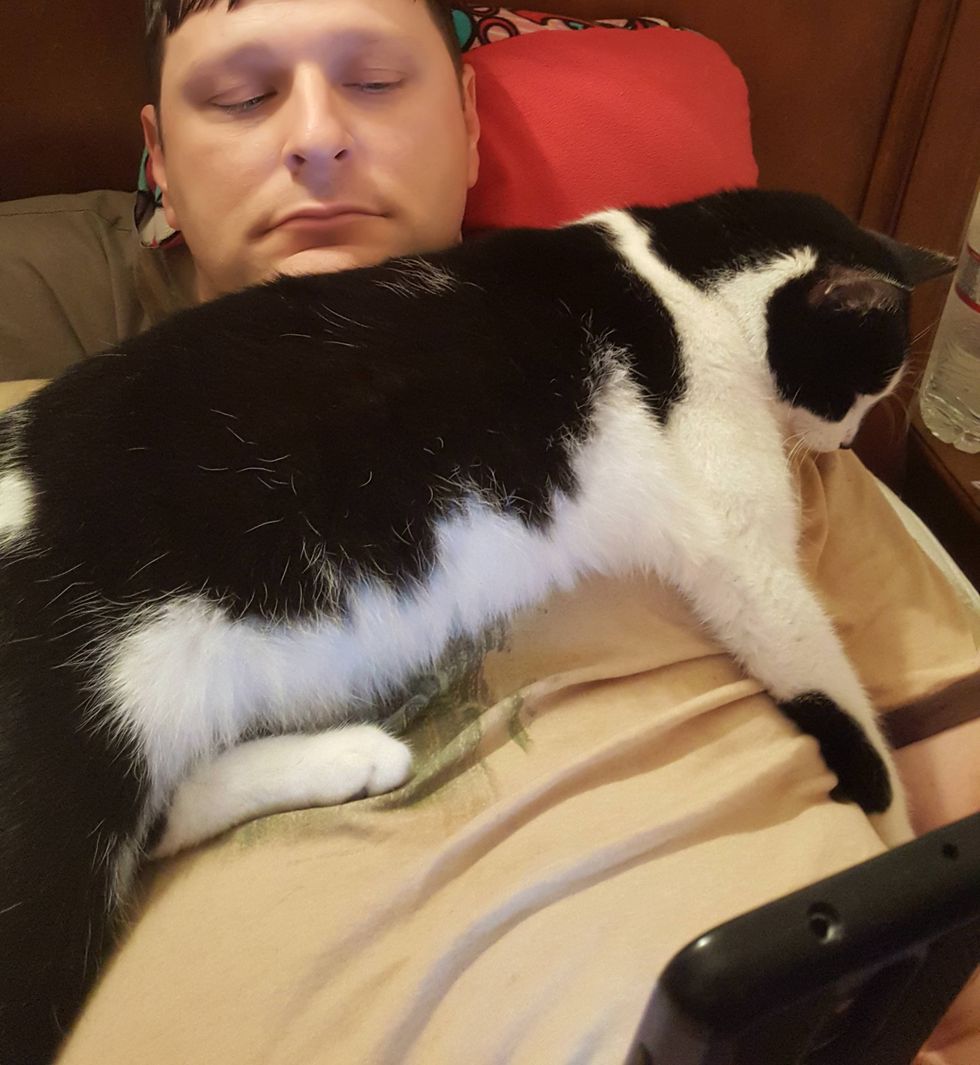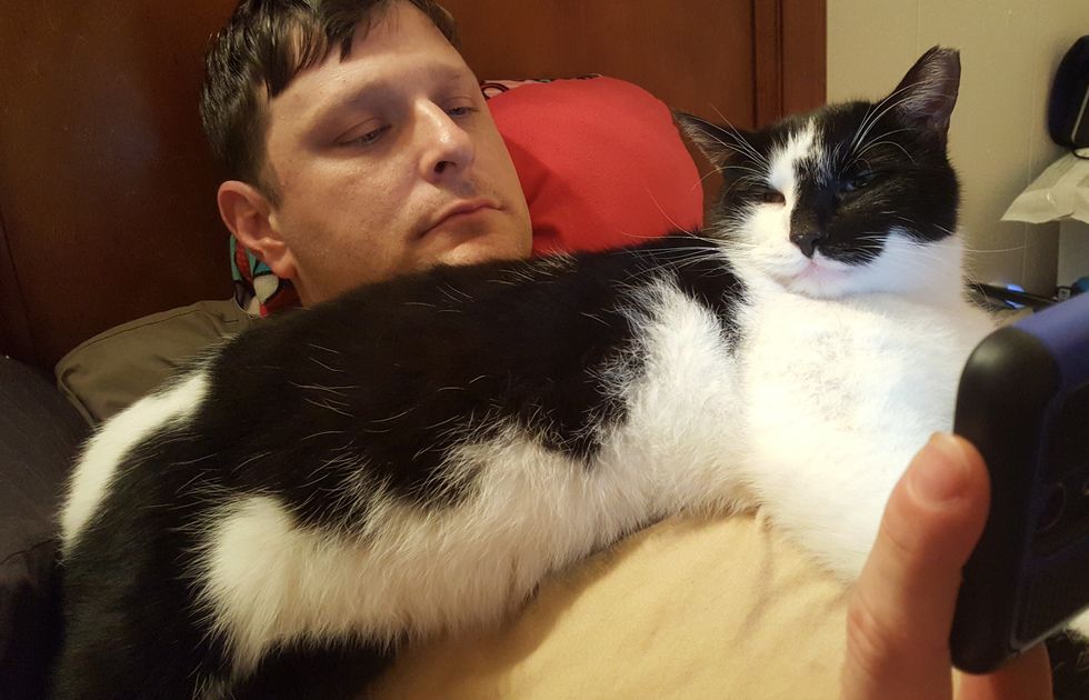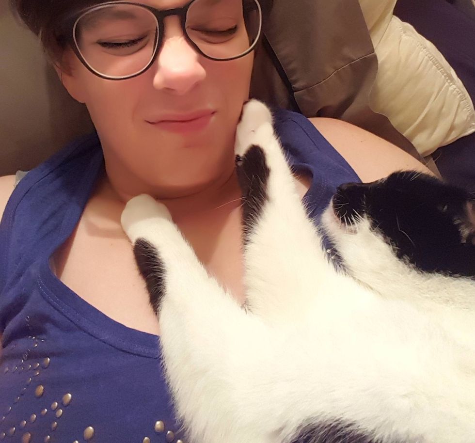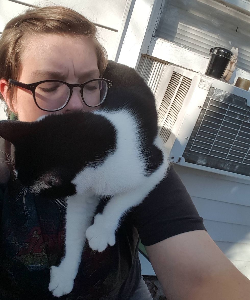 "First time we met, he walked right up to me and jumped on my back. He started rubbing his face on my face, and climbing all over me," imgur user Fleurdangereux said. "I originally called him 'personal space cat', and we thought he was a female."