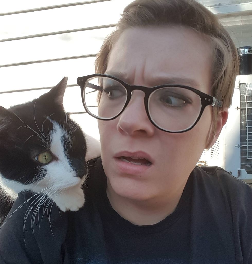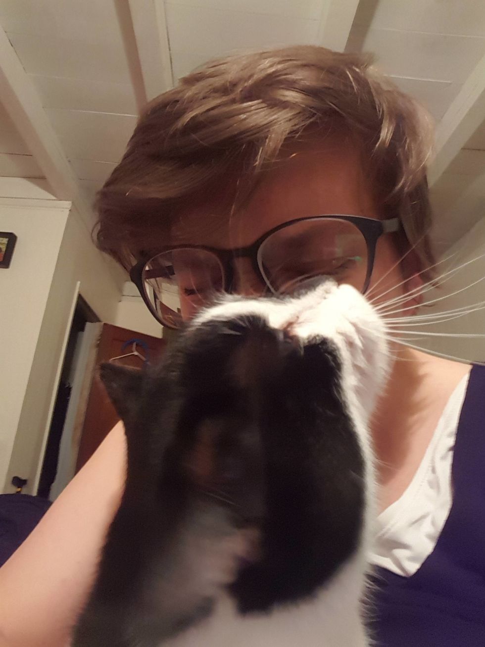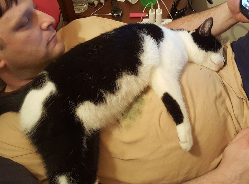 "First time we met, he walked right up to me and jumped on my back. He started rubbing his face on my face, and climbing all over me," imgur user Fleurdangereux said. "I originally called him 'personal space cat', and we thought he was a female."