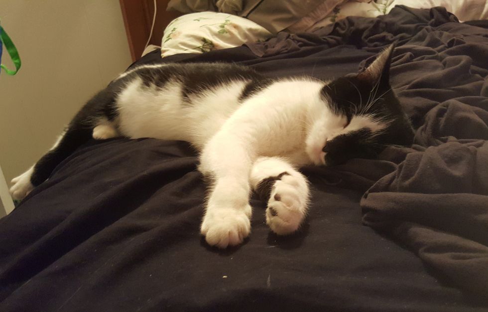 As soon as he moved in, the kitty took over their bed in the master bedroom and felt right at home.