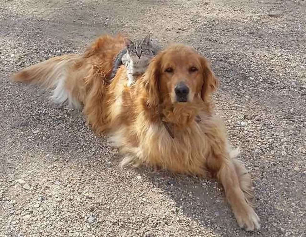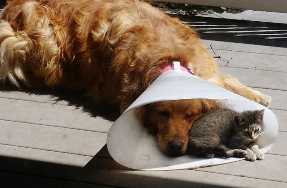 Reddit user kelldog24 shared photos of his loyal friends - a big fluffy Golden Retriever and a tabby cat - where the Goldie is wearing the cone of shame but his feline friend keeps him company by snuggling next to him in da hood.