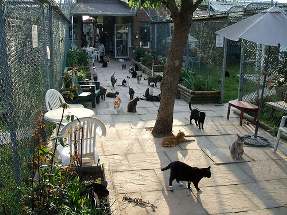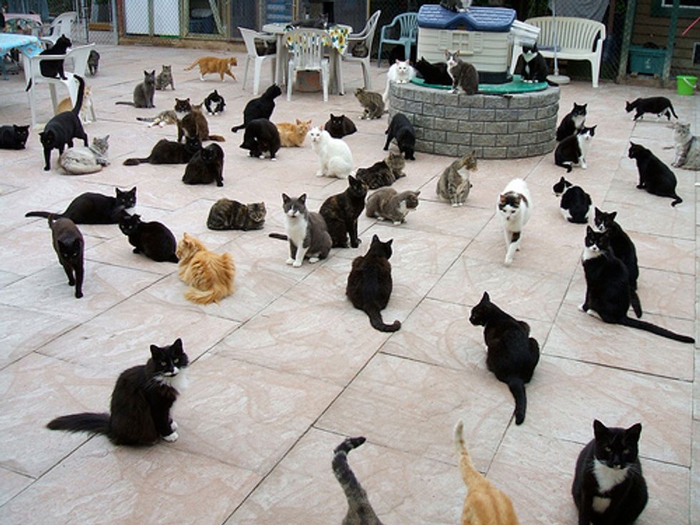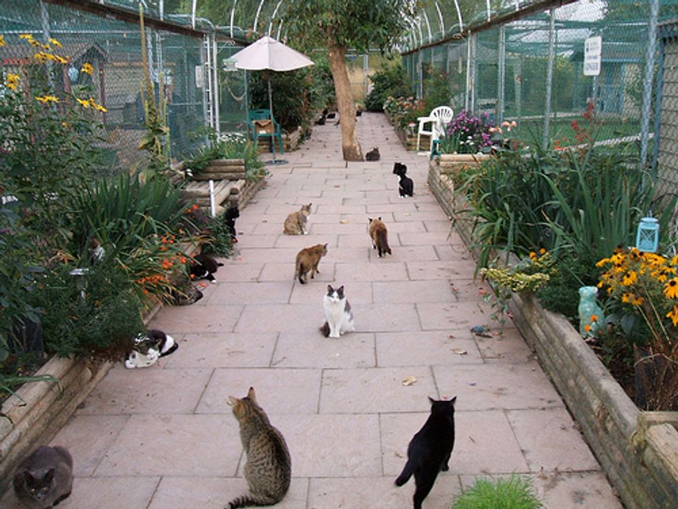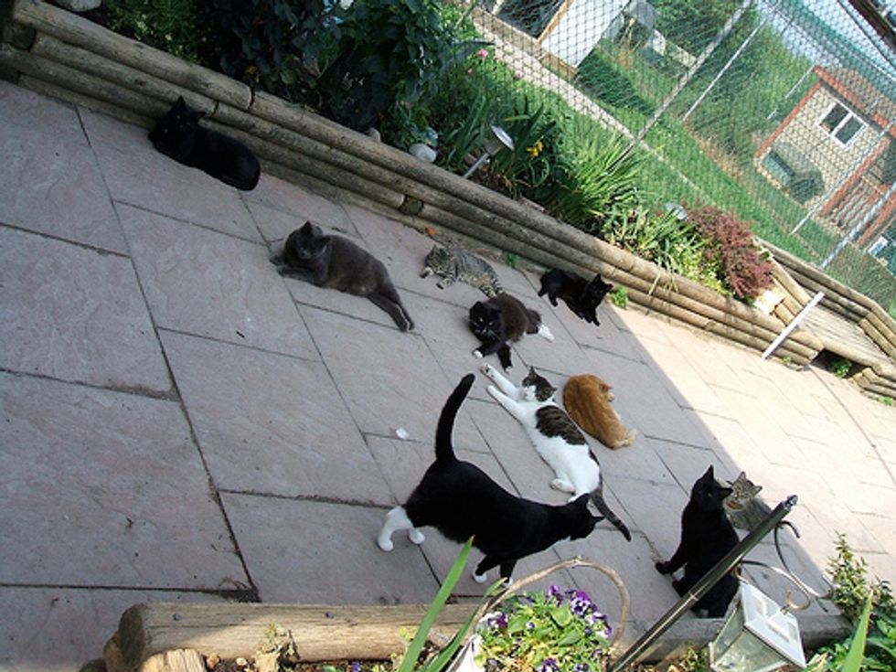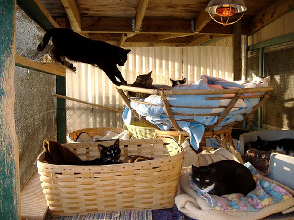 The cat sanctuary provides a comfortable and safe permanent home for more than 800 animals. Cats can freely roam in a fully fenced backyard and lounge comfortably by the well, on a deck, on a bench or simply on the ground. The cat sanctuary is like a paradise to so many formerly homeless kitties. Volunteers have created a loving, cozy and stimulating environment that is truly a home for the animals.