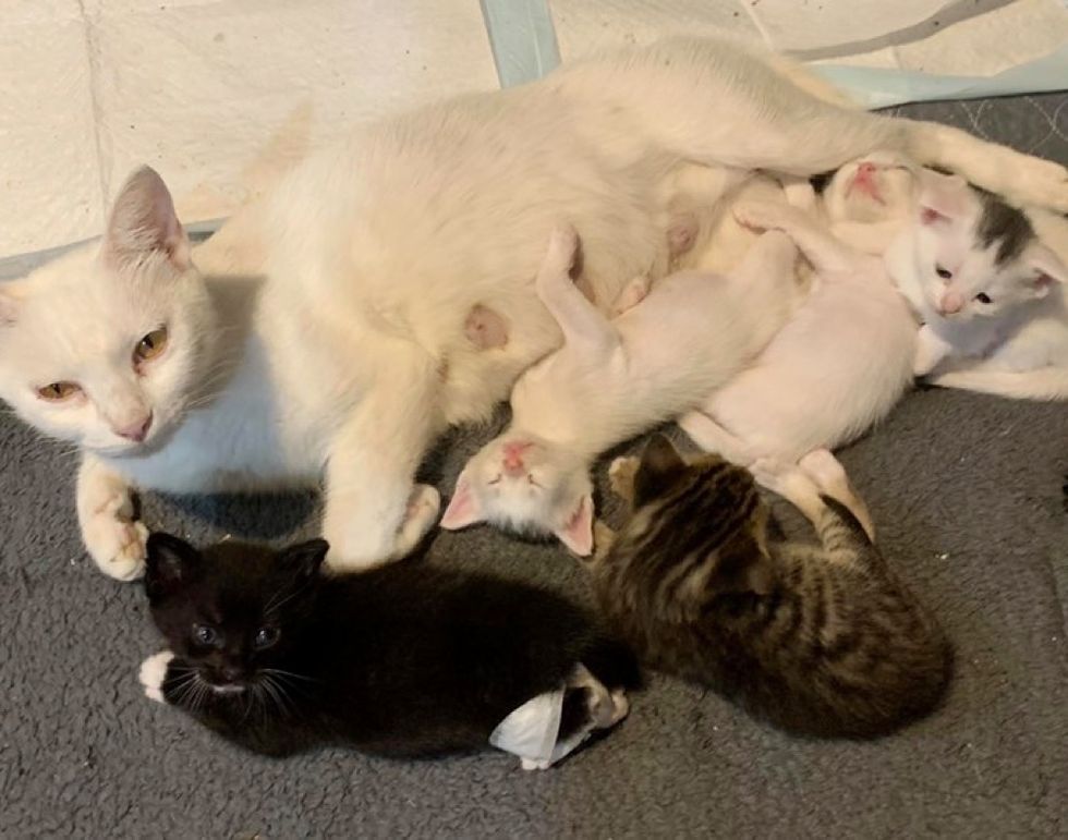 The stray must have come to the location to give birth as the kittens were very young. She was just skin and bones but continued to nurse her babies. Despite trying desperately to keep them safe, dumpsters were nearby and it was not a good place to raise her young.