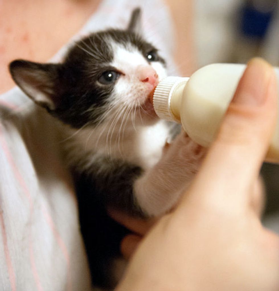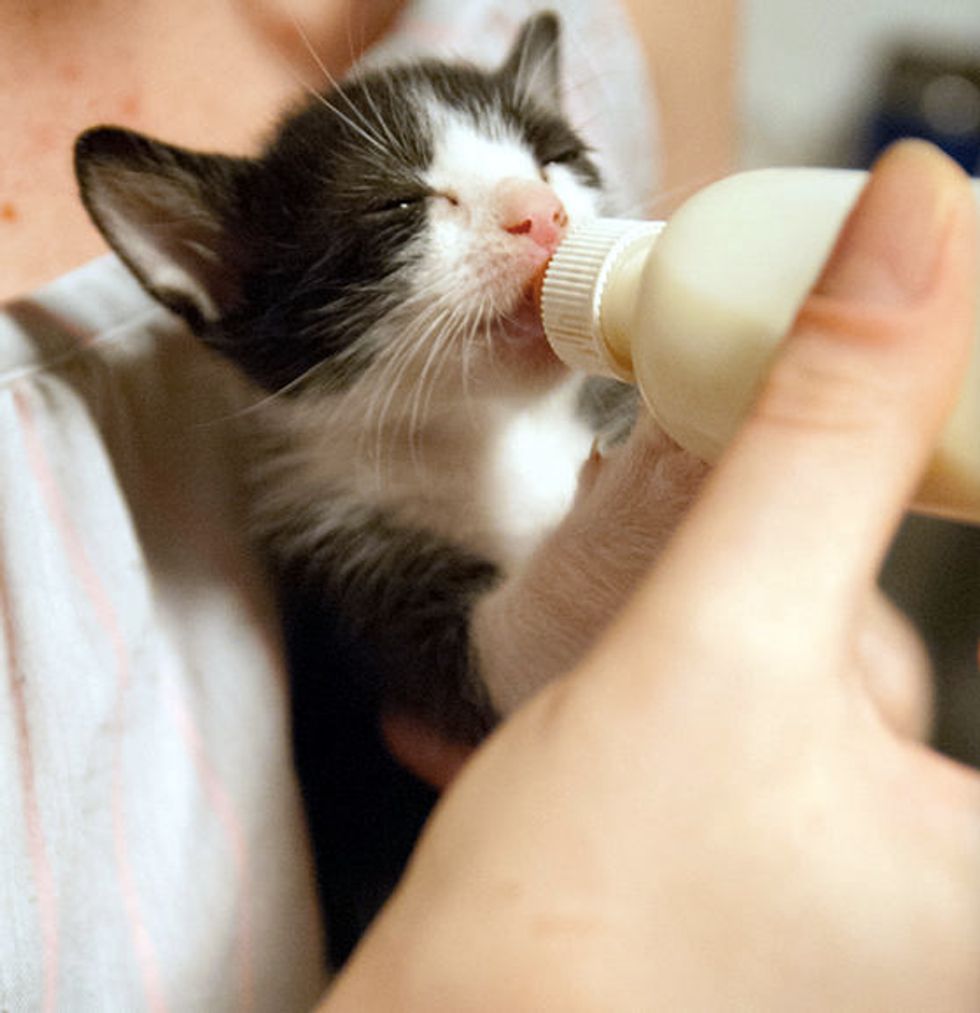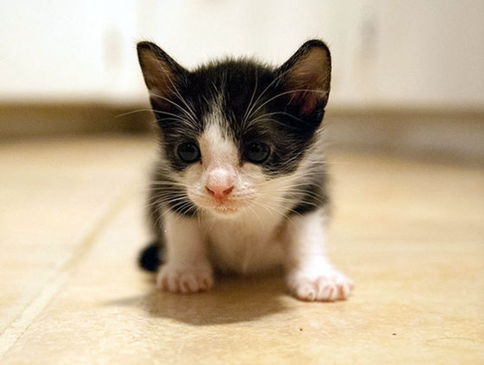 This tiny tuxedo is one of the four kittens found under a shed. Alison and Brendan took in the orphan kittens and started bottle feeding them round the clock. "They found them all living under the shed in their backyard, the mom was no where to be found," said Keller H., but now they are in good hands, and getting ready for their forever homes (in Austin, Texas).