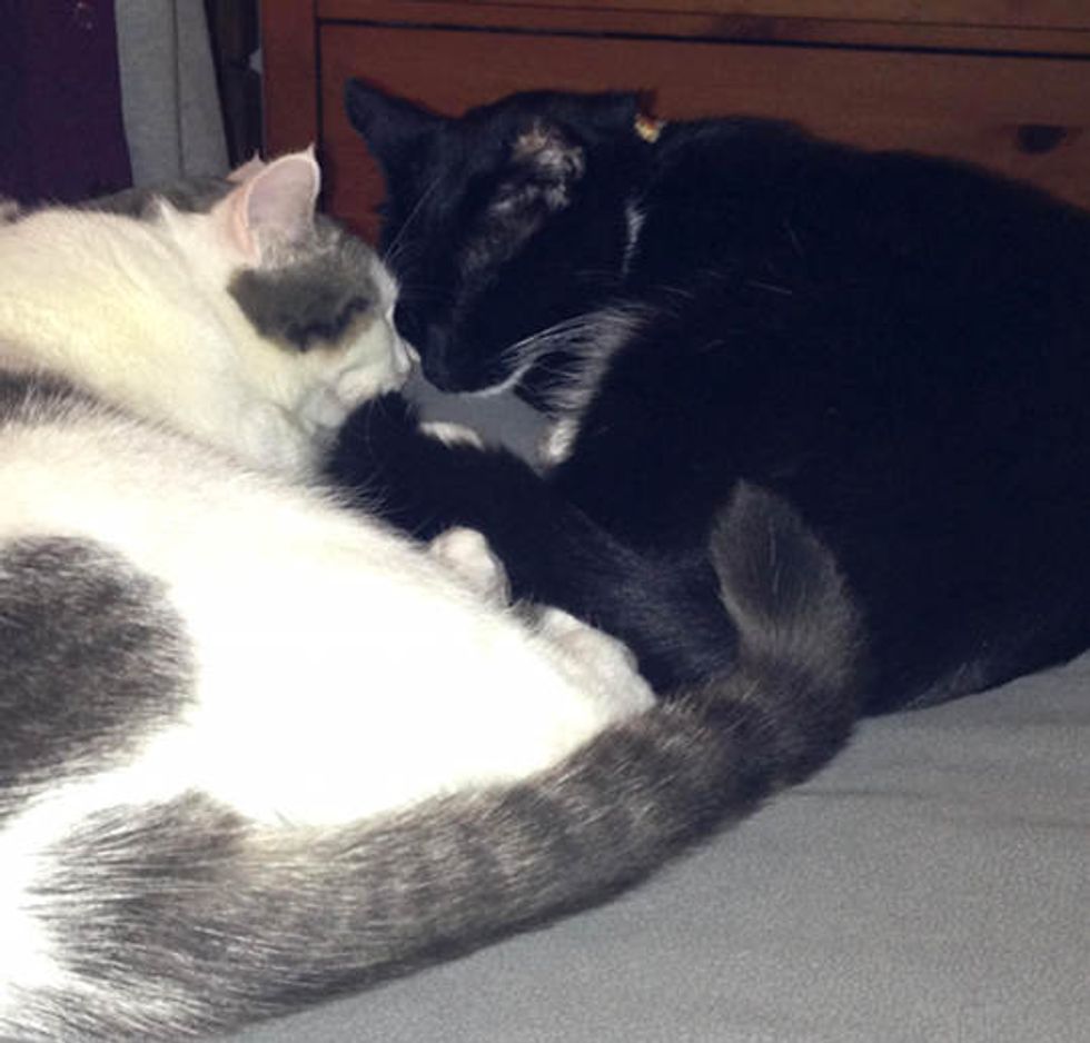 Giving a head bump to her best friend in her forever home!