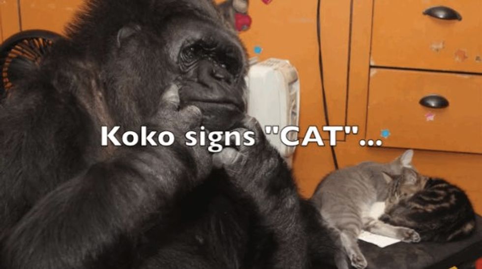 Koko telling her caregivers through sign language how happy she is to have her new fur babies!