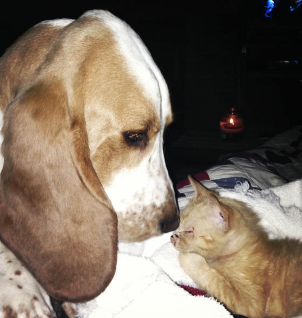 A ginger kitten was rescued by a Basset Hound in a roadside brush. She brought him home.
