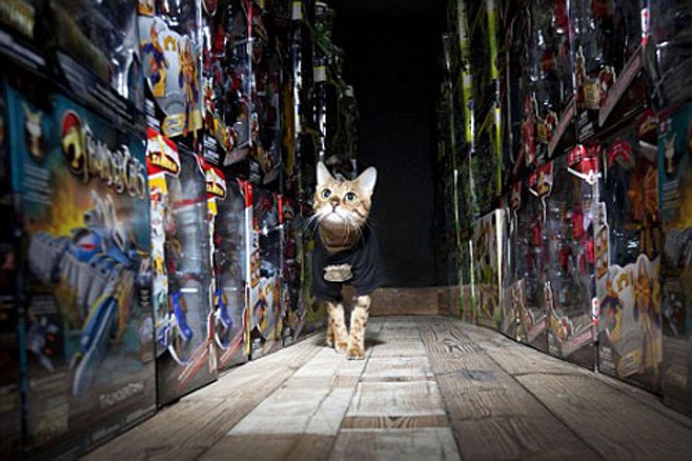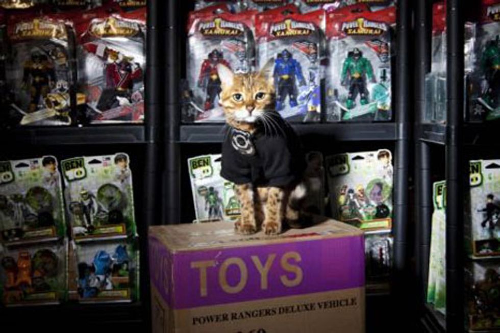 Millie the Bengal cat was found wandering in the aisles in a toy factory. The factory workers spotted him and thought he would be their purrfect security guard for their top selling toys.