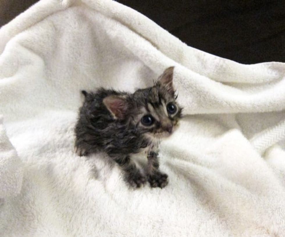 This is tiny Merlin, an orphaned kitten, after his first bath.