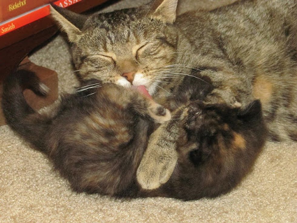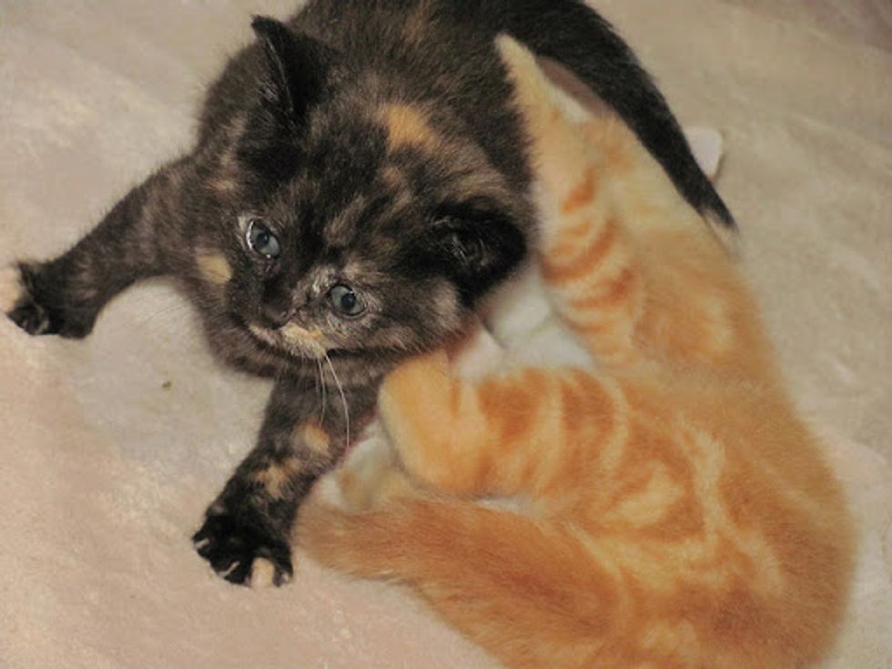 Little Bijou was the first to have a name: she was my little jewel. I knew she could easily have long-term neurologic damage from the delivery. It took extra encouragement to get her to nurse, but I made sure she got to eat her fill every day. Bijou lagged behind her siblings on walking, running, etc. She had a wobble to her gait for weeks. I put hours of special attention toward this wee one. Bijou loved nothing more than to cuddle up against me for her naps. One Sunday I finally asked my husband for permission to keep Bijou as she had nestled herself deep into my heart. My husband agreed. Within only a matter of hours, however, someone I knew would be a loving, responsible owner expressed interest in adopting both Basil (Bijou's litter mate) and Bijou. I knew it was right to let her go live with her sister. I let this amazing little girl go, and she is thriving in her new home.