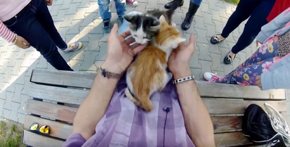 Two little kittens went up a tree and were too frightened to climb back down. When a biker heard their cries, he went to the rescue.