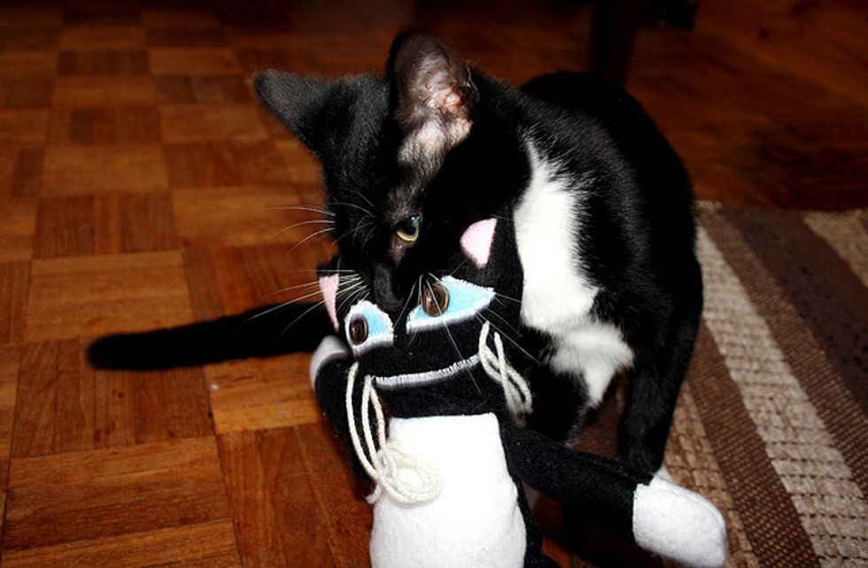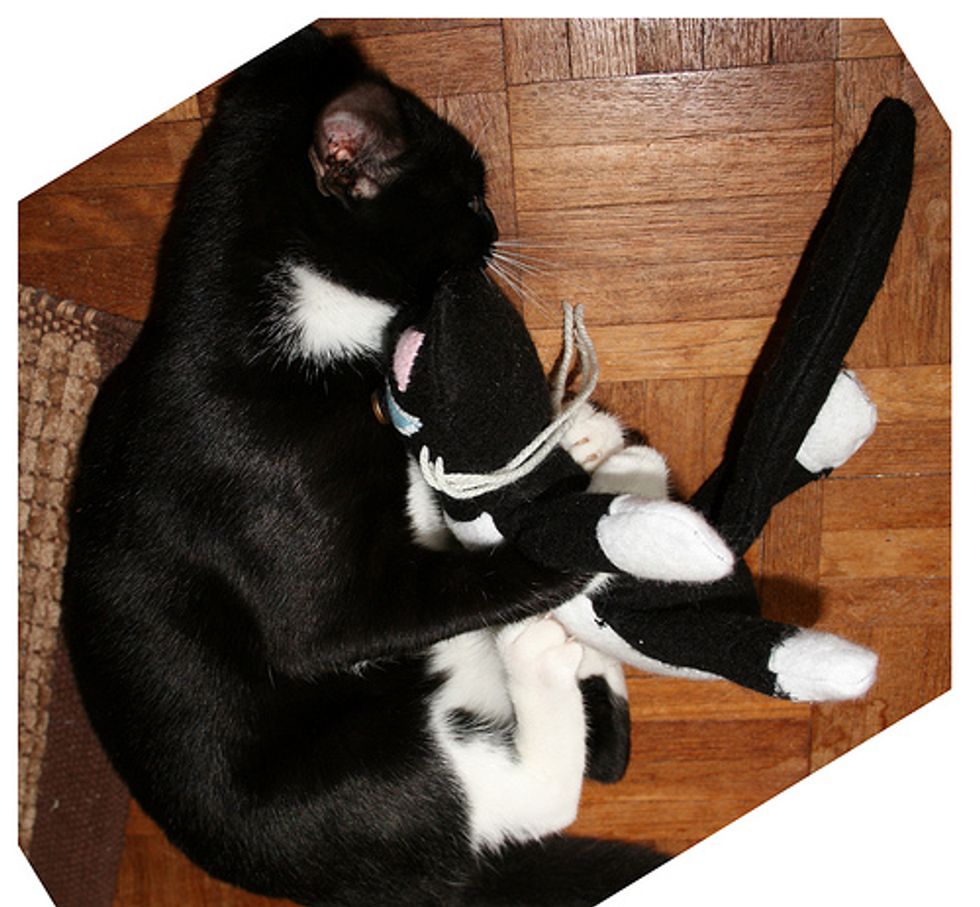 I felt a bit sorry for Billi at the beginning for having no other kittens to play with, so I created a toy cat named Run-O, more or less for fun. But within minutes she took to that little guy and she was hardly seen without him since. He is almost completely destroyed by now, but she still won't let go of him and didn't accept a replacement I made for her. She carries him around like a baby one minute, attacks him like a prey the next one and then you can see her liking him like a friend again. It's very fun to watch.