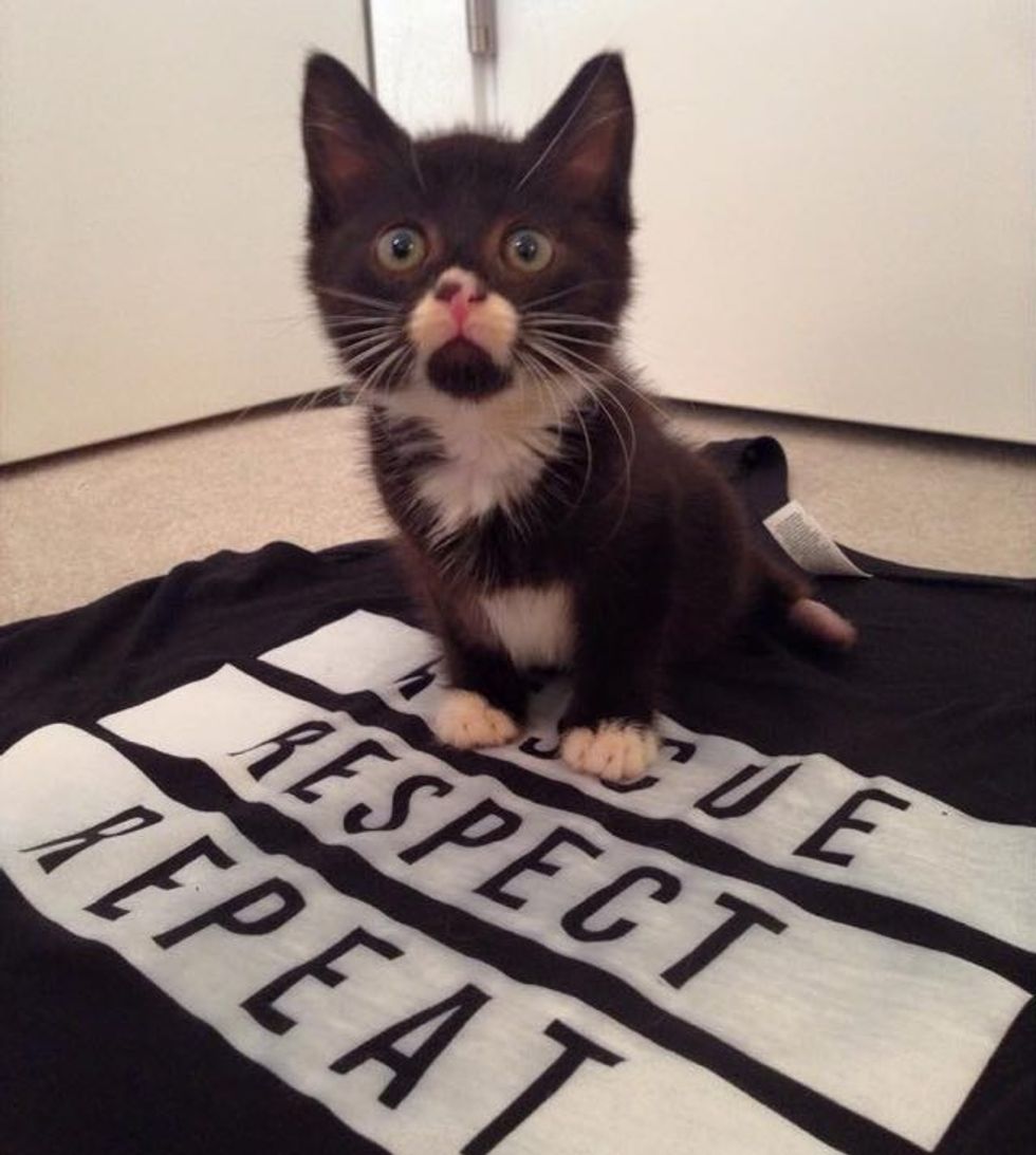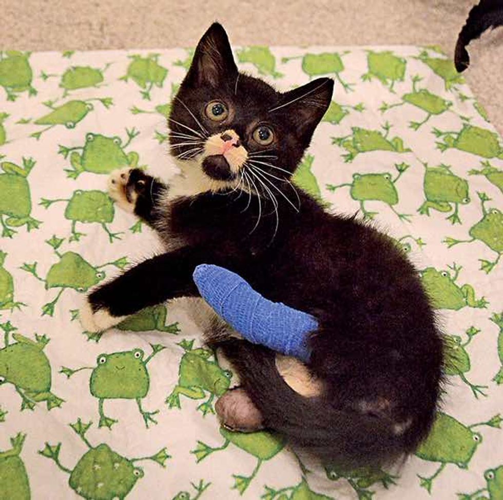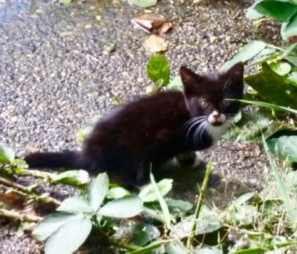 The little black and white kitten was found scrambling around on his two front paws at a rural property in the Otter-Aldergrove area of Langley. His little body had just about given out from starvation and infection by the time he was rescued, but he never gave up!