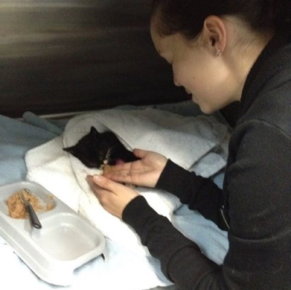 Vet tech Natalie (of Mr. Magoo The Cat) finger-feeding him in this photo and he's loving it.