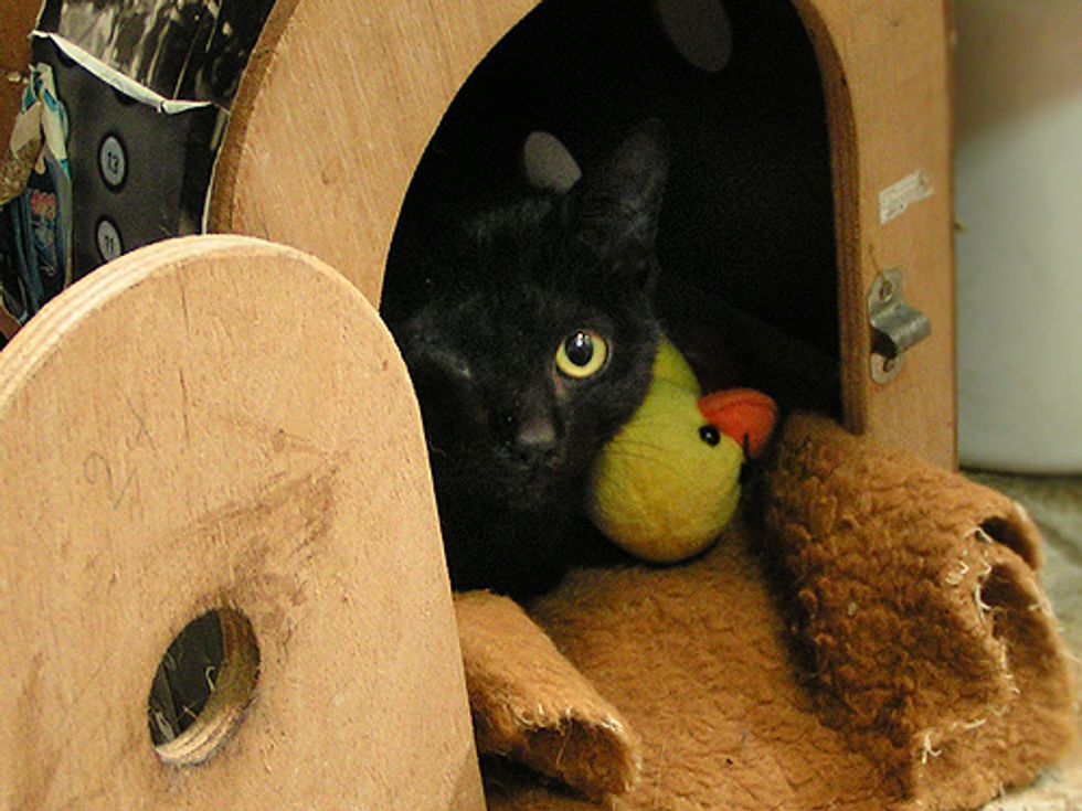 Black was very shy and scaredy at first and was not approachable to anyone. However, when she was introduced to two new born kittens, her motherly instinct unraveled. She began to groom and care for the kittens so much that the real cat mother became extremely jealous.