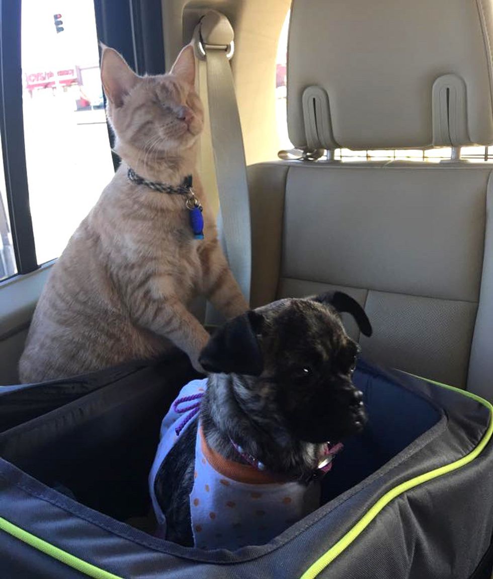 The two best friends never leave each other's side when they travel. Mowgli is Scarlett's purrsonal bodyguard.