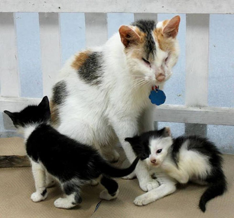 "Kitna is a blind mother cat originally discovered in New York nursing a litter of newborn kittens. Whether Kitna was abandoned blind, pregnant and alone we will never know. Someone brought Kitna and her kittens to an overcrowded shelter where she was almost euthanized. That's when we stepped in to save Kitna's family," North Shore Animal League America wrote on Facebook.