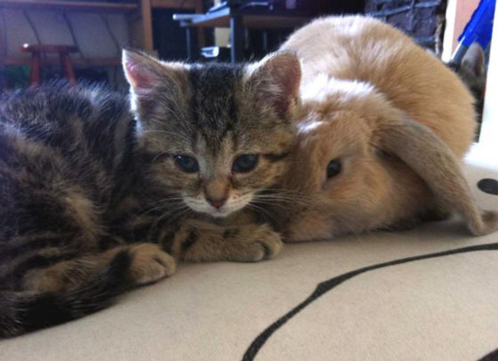 An interspecies friendship started to bloom when a blind rescue kitten met a rabbit at her foster home. The gentle, sweet orphan kitten approached the bunny for companionship one day, and the rest is history.