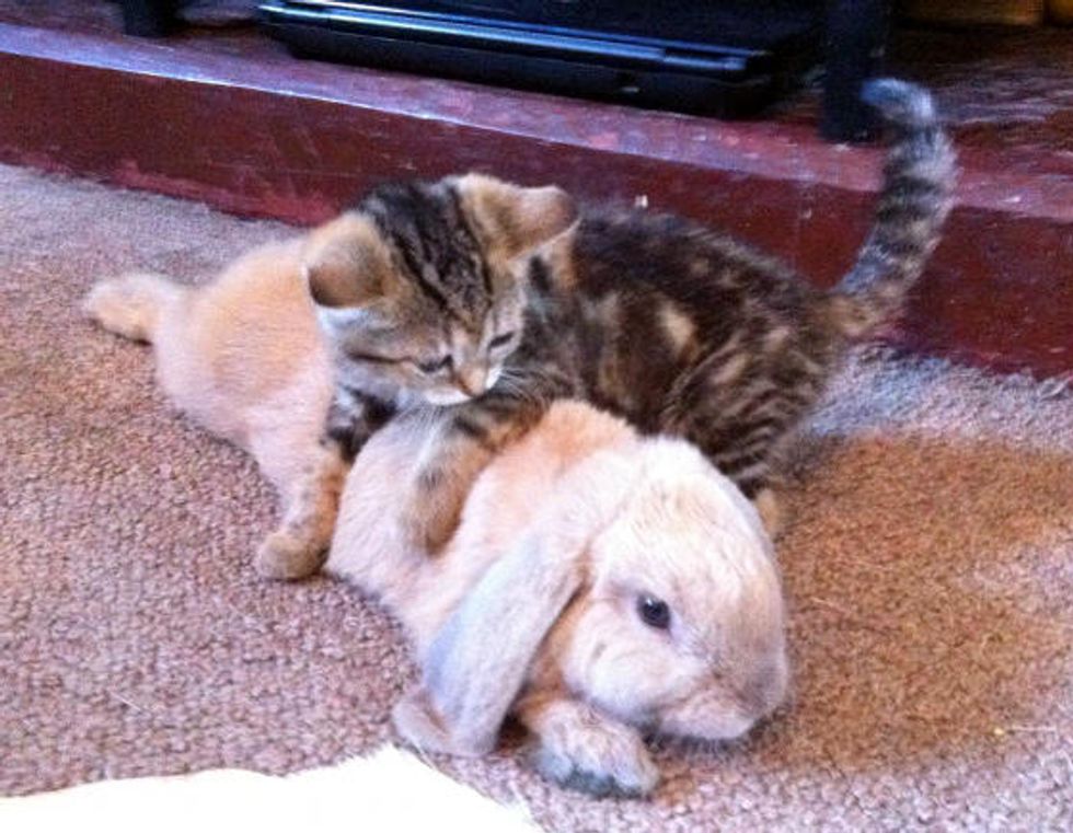 They are often seen snuggling with each other as if the rabbit ensures the little blind kitty that everything will be all right.