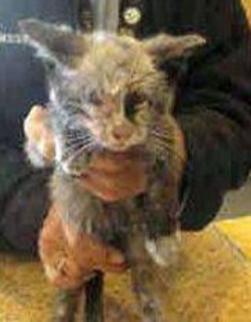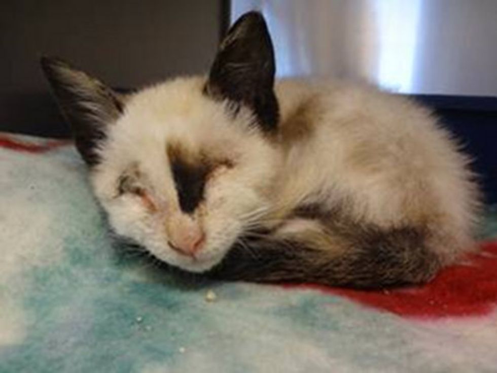 A blind 6-week-old kitten was saved from motor oil. Her life was changed forever when Mary S. Roberts Pet Adoption Center took her in.